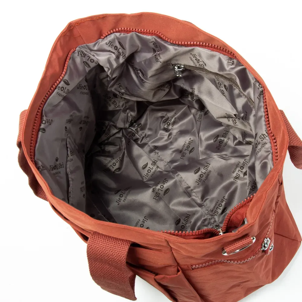 Внутри находятся два больших открытых отделения для банкнот (разделены кожаной перегородкой), 4 больших кармана и 5 карманов для визитных карт, один из которых выполнен прозрачным. Снаружи кошелька на обратной стороне есть двойная монетница на молнии.