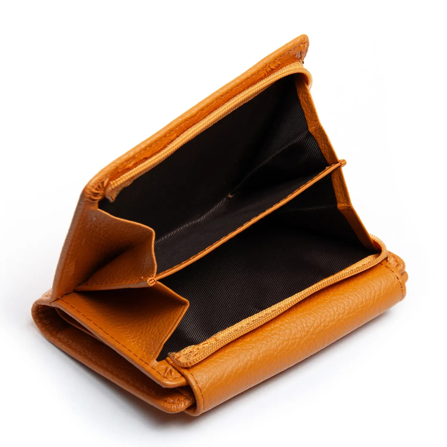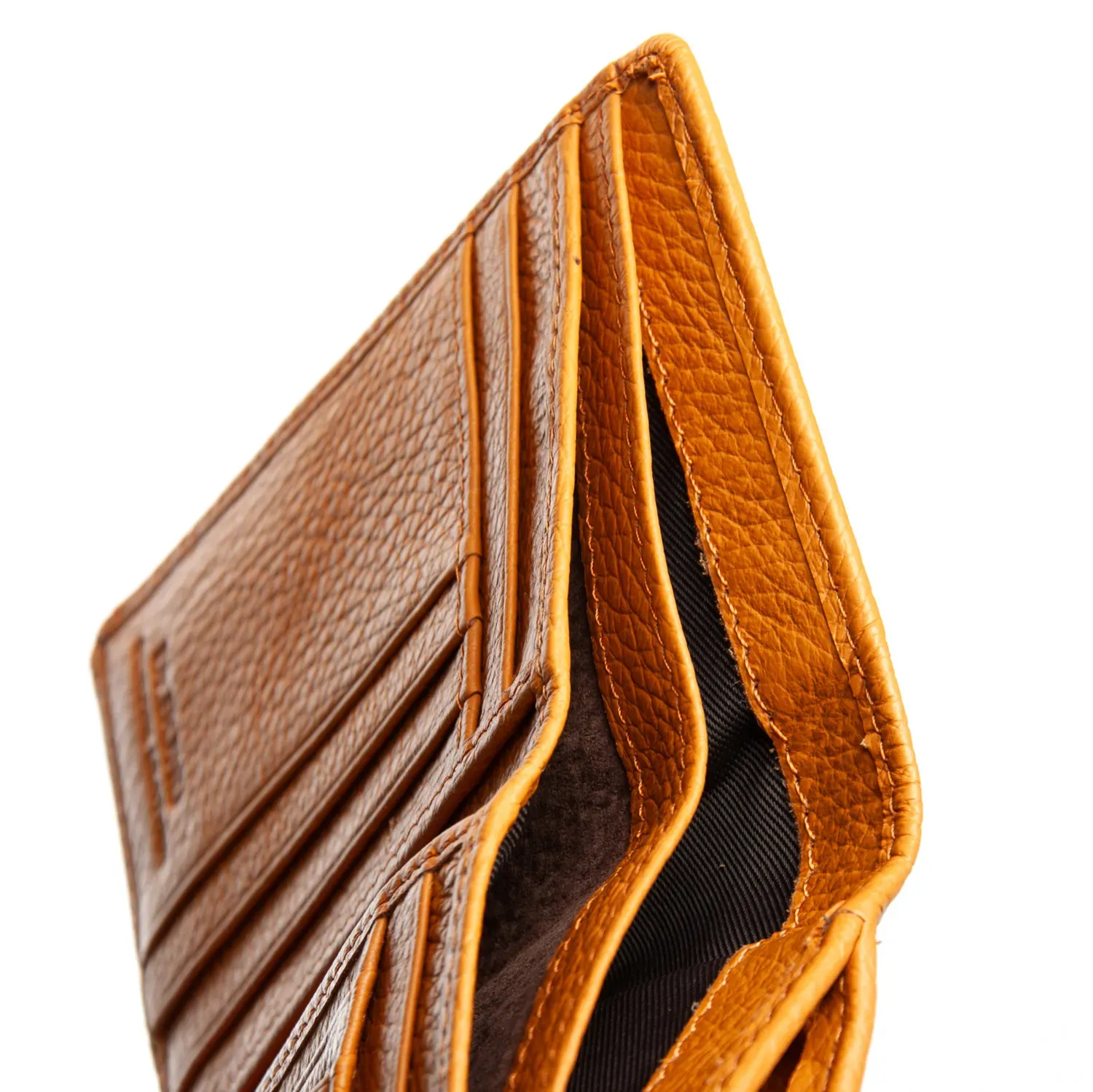 Внутри находятся два больших открытых отделения для банкнот (разделены кожаной перегородкой), 4 больших кармана и 5 карманов для визитных карт, один из которых выполнен прозрачным. Снаружи кошелька на обратной стороне есть двойная монетница на молнии.