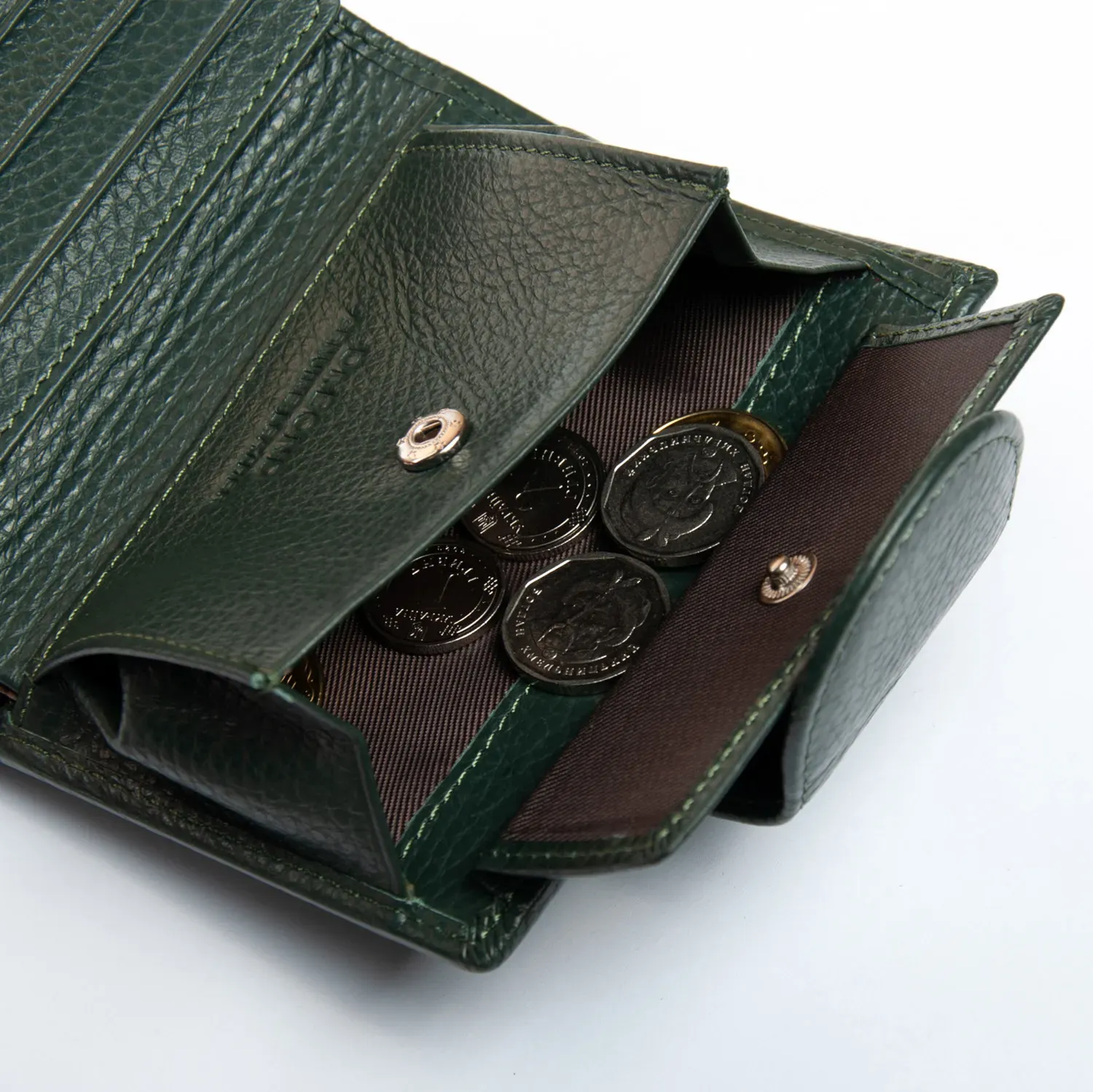 Внутри находятся 2 открытых отделения для банкнот, разделенные кожаной перегородкой, 3 кармана для визитных карт и два больших прозрачных кармана на откидном блоке. Также внутри кошелька находится монетница под клапаном на кнопке.