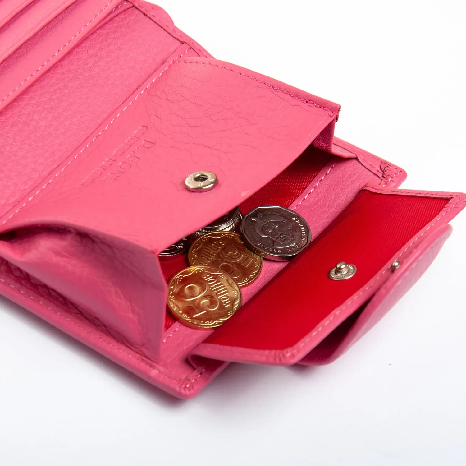 Внутри находятся 2 открытых отделения для банкнот, разделенные кожаной перегородкой, 3 кармана для визитных карт и два больших прозрачных кармана на откидном блоке. Также внутри кошелька находится монетница под клапаном на кнопке.