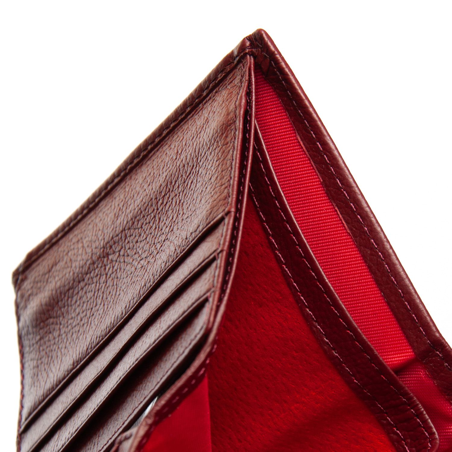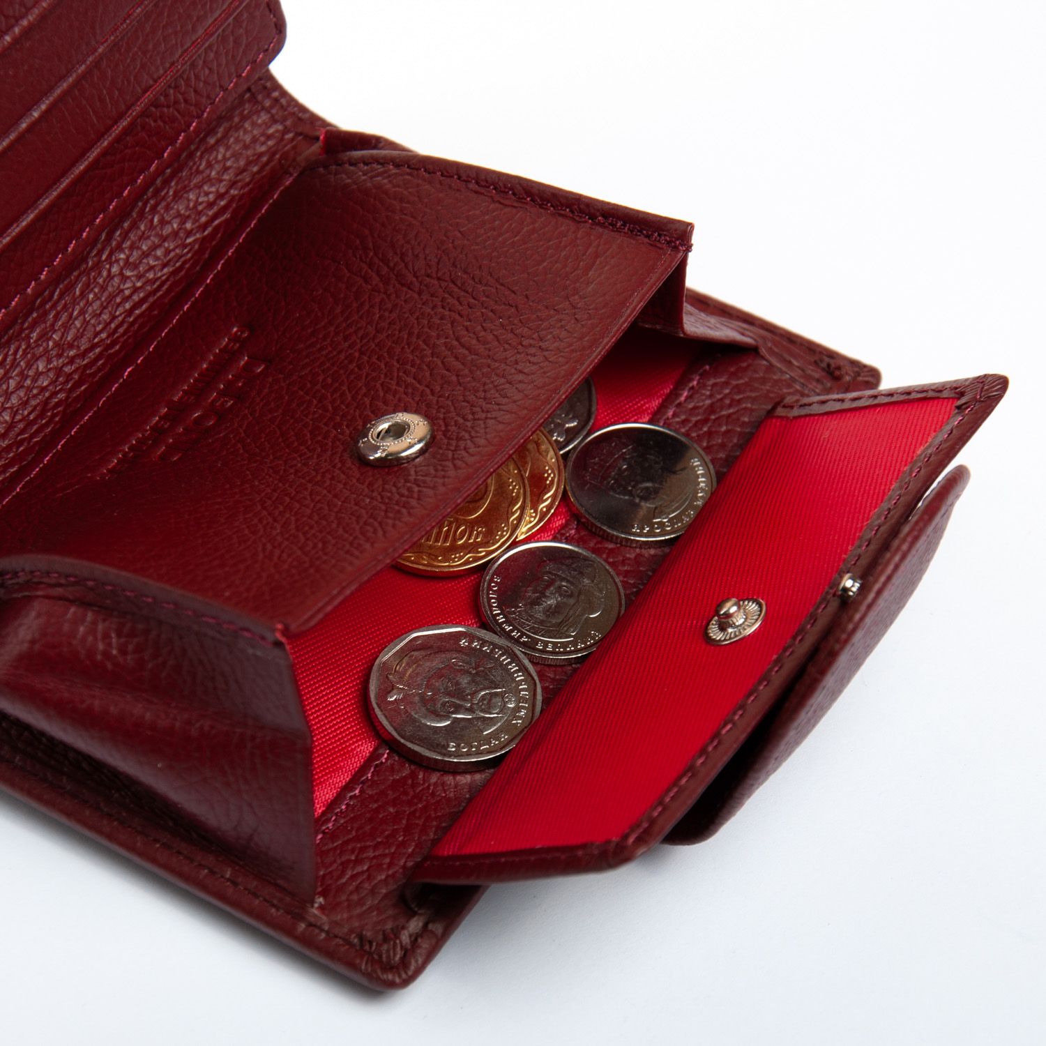 Внутри находятся 2 открытых отделения для банкнот, разделенные кожаной перегородкой, 3 кармана для визитных карт и два больших прозрачных кармана на откидном блоке. Также внутри кошелька находится монетница под клапаном на кнопке.
