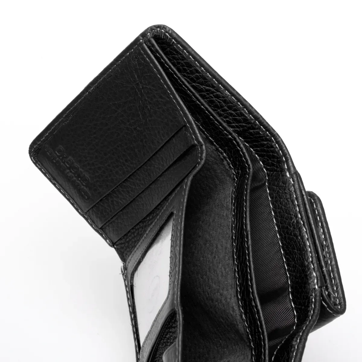 Внутри находятся два больших открытых отделения для банкнот (разделены кожаной перегородкой) и 7 карманов для визитных карт, один из которых выполнен прозрачным. Снаружи кошелька на обратной стороне есть монетница на кнопке.