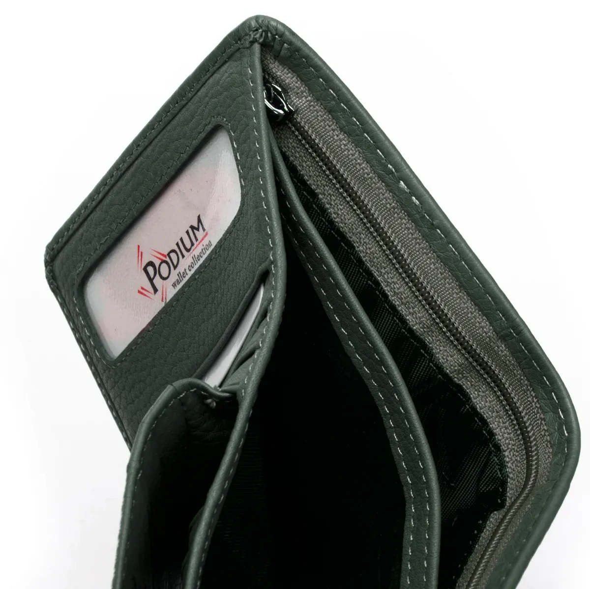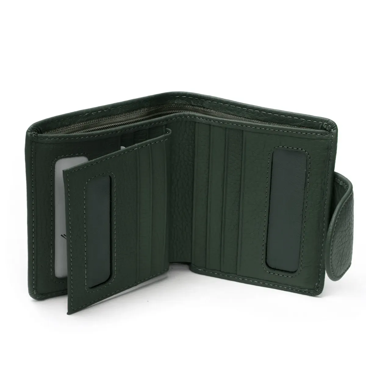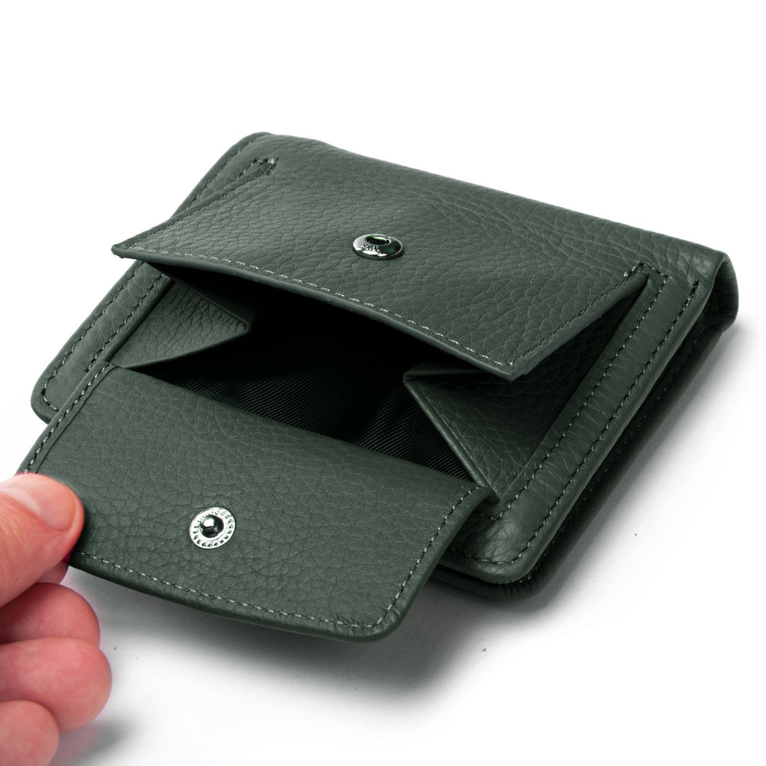 Внутри находятся два больших открытых отделения для банкнот (разделены кожаной перегородкой) и одно отделение на молнии. Также есть 12 карманов для визитных карт, 4 из которых выполнены прозрачными. Снаружи кошелька на обратной стороне есть монетница на кнопке.