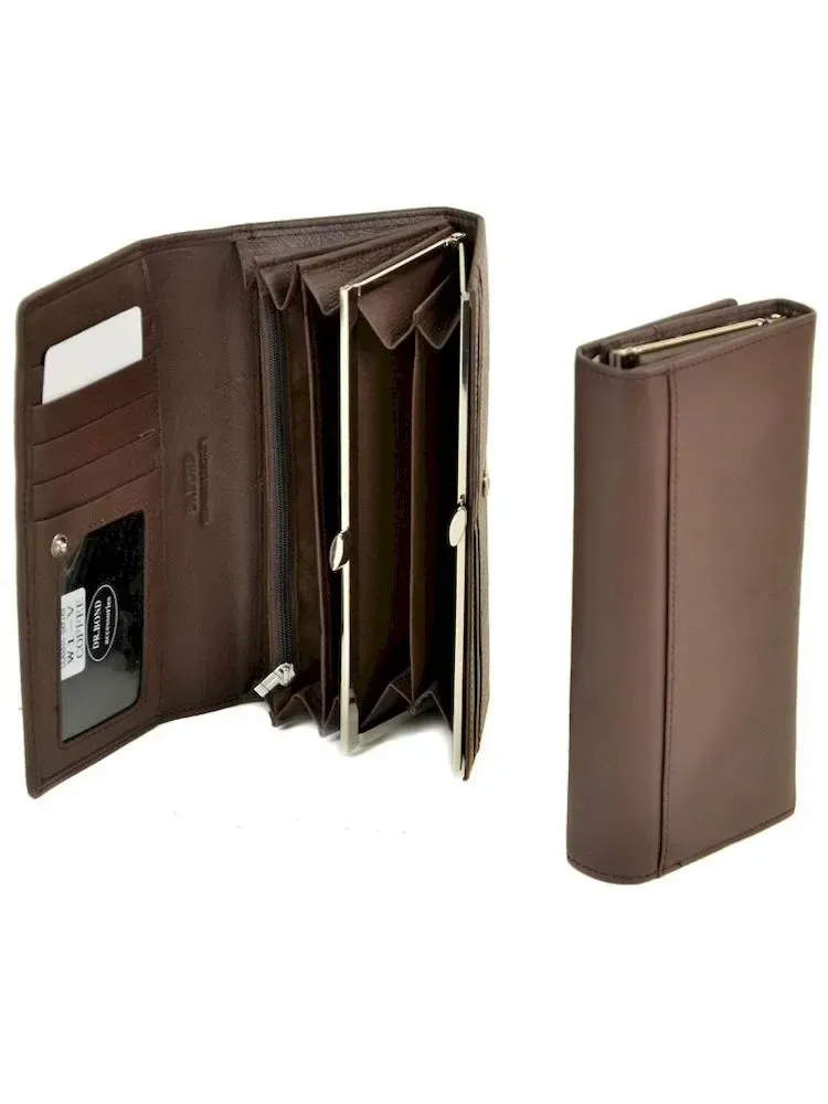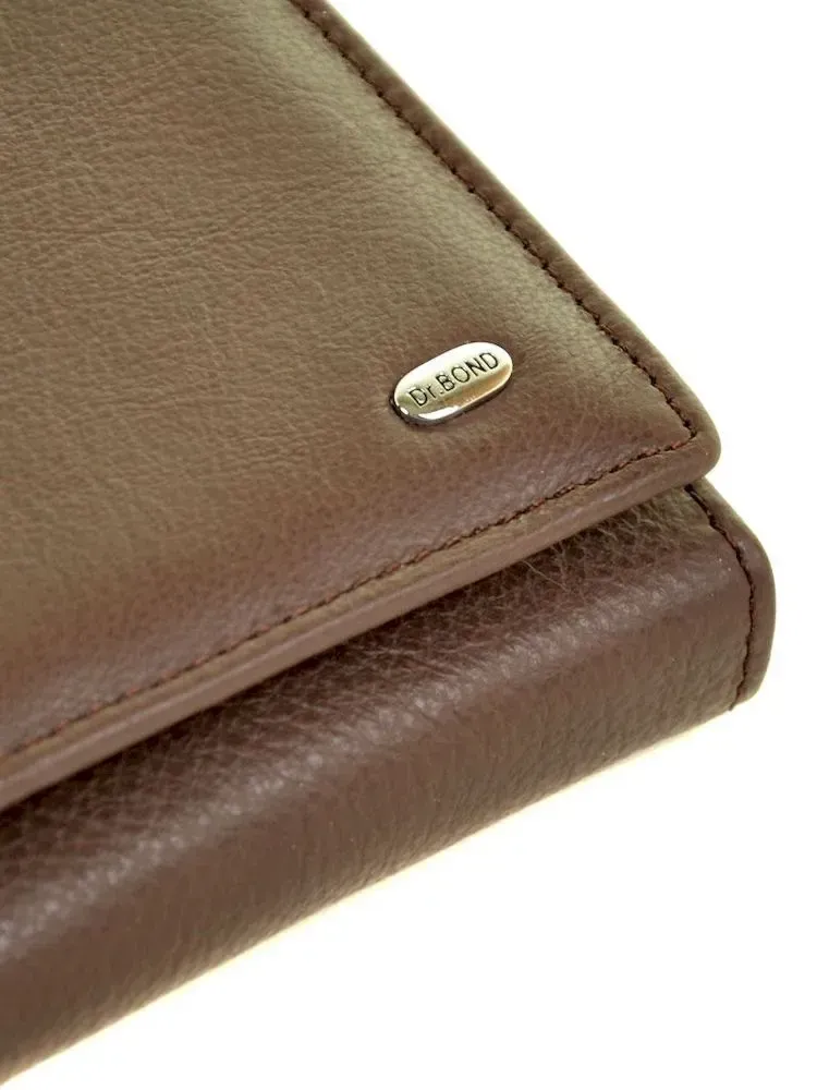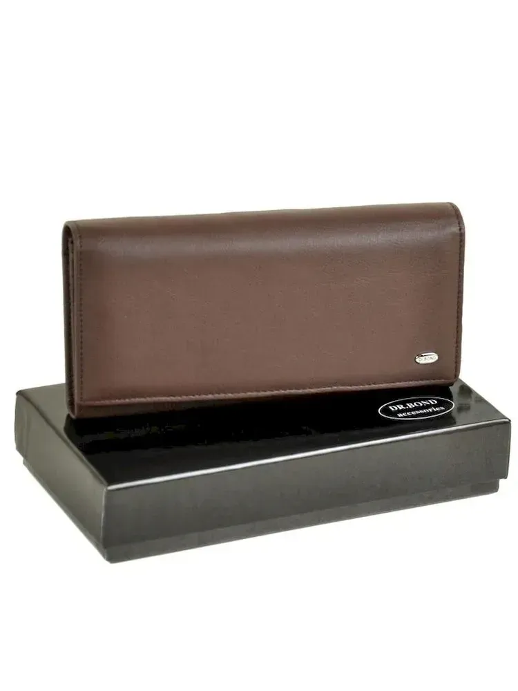 Великий шкіряний жіночий гаманець Dr.Bond. Закривається кнопку. Усередині знаходяться три відділення для банкнот, монетниця на клямці, велика відкрита кишеня та кишеня на блискавці. Дев'ять кишень для карток і одна кишеня виконана прозорою. Зовні на зворотному боці є велика відкрита кишеня. Розмір (см) 18,5*9,5*3,5