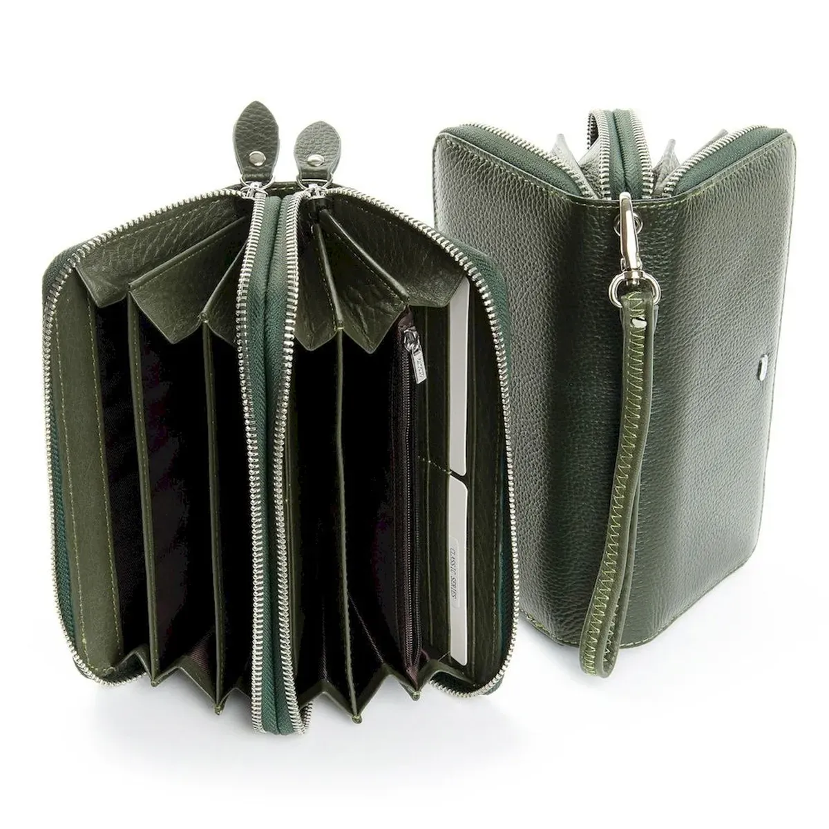 Великий жіночий гаманець-клатч Dr.Bond. Виготовлений із натуральної м'якої шкіри з натуральною тестурою. Два відділення, що закриваються на блискавку. Усередині кожного відділення є 3 кишені для банкнот. У передньому відділенні також знаходиться кишеня для дрібниці на блискавці, дві великі відкриті кишені та 8 кишень для візитних карток. У комплекті кистьовий ремінець.