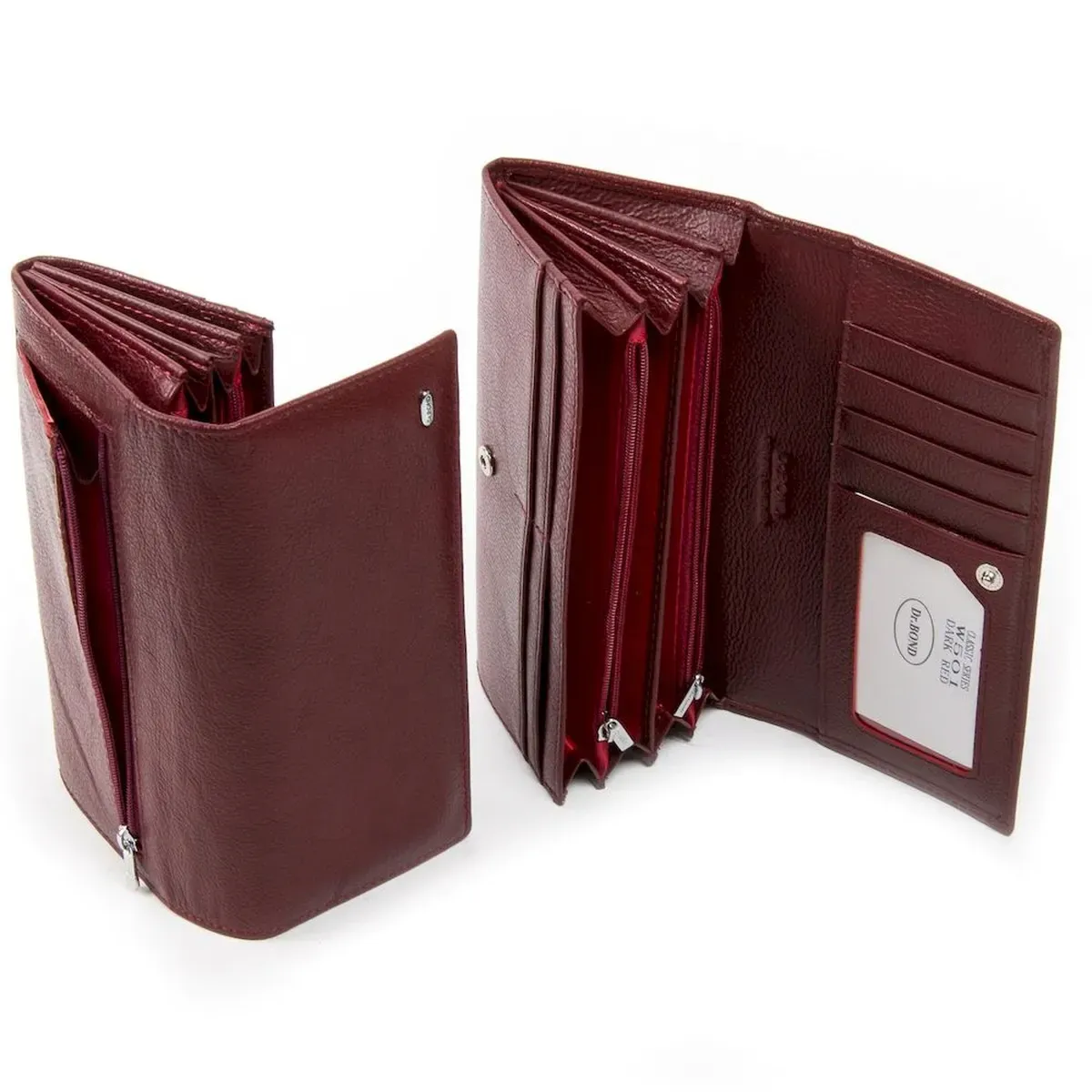 Великий полегшений жіночий гаманець Dr.Bond. Виготовлений із натуральної м'якої шкіри з природною текстурою. Закривається кнопку. Усередині знаходяться 4 відділення для банкнот, дві кишені-монетниці на блискавці, велика відкрита кишеня та 9 кишень для карток та візиток. Зовні гаманець на звороті є кишеню на блискавці. Розмір (см) 18,5*9*3,5