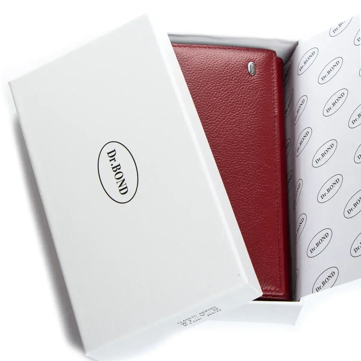 Великий шкіряний жіночий гаманець Dr.Bond. Закривається на магнітну застібку. Усередині знаходяться три відділення для банкнот, монетниця на клямці, велика відкрита кишеня та кишеня на блискавці. 10 кишень для візитних карток. Зовні на звороті є велика відкрита кишеня.