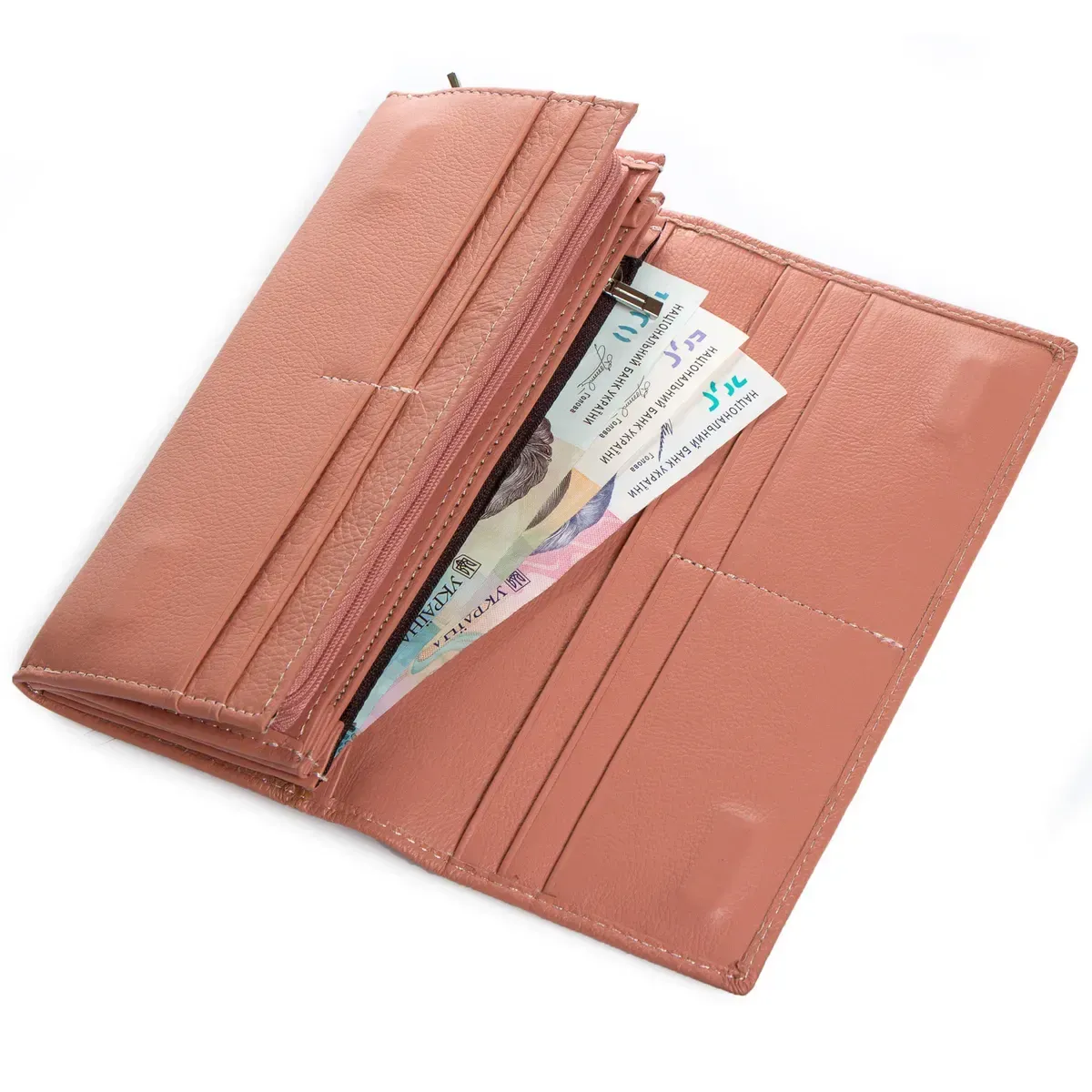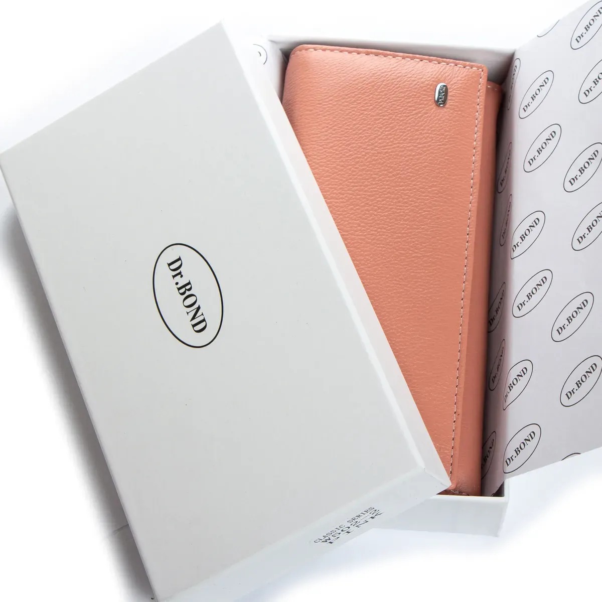 Великий полегшений жіночий гаманець DR. BOND. Виготовлений із натуральної м'якої шкіри з природною текстурою. Закривається на прихований магніт. Усередині знаходяться 3 відкритих відділення для банкнот і одне подвійне відділення на блискавці, кишеня-монетниця на блискавці, велика відкрита кишеня та 8 кишень для карток та візиток. Зовні гаманця на звороті є кишеня на блискавці.