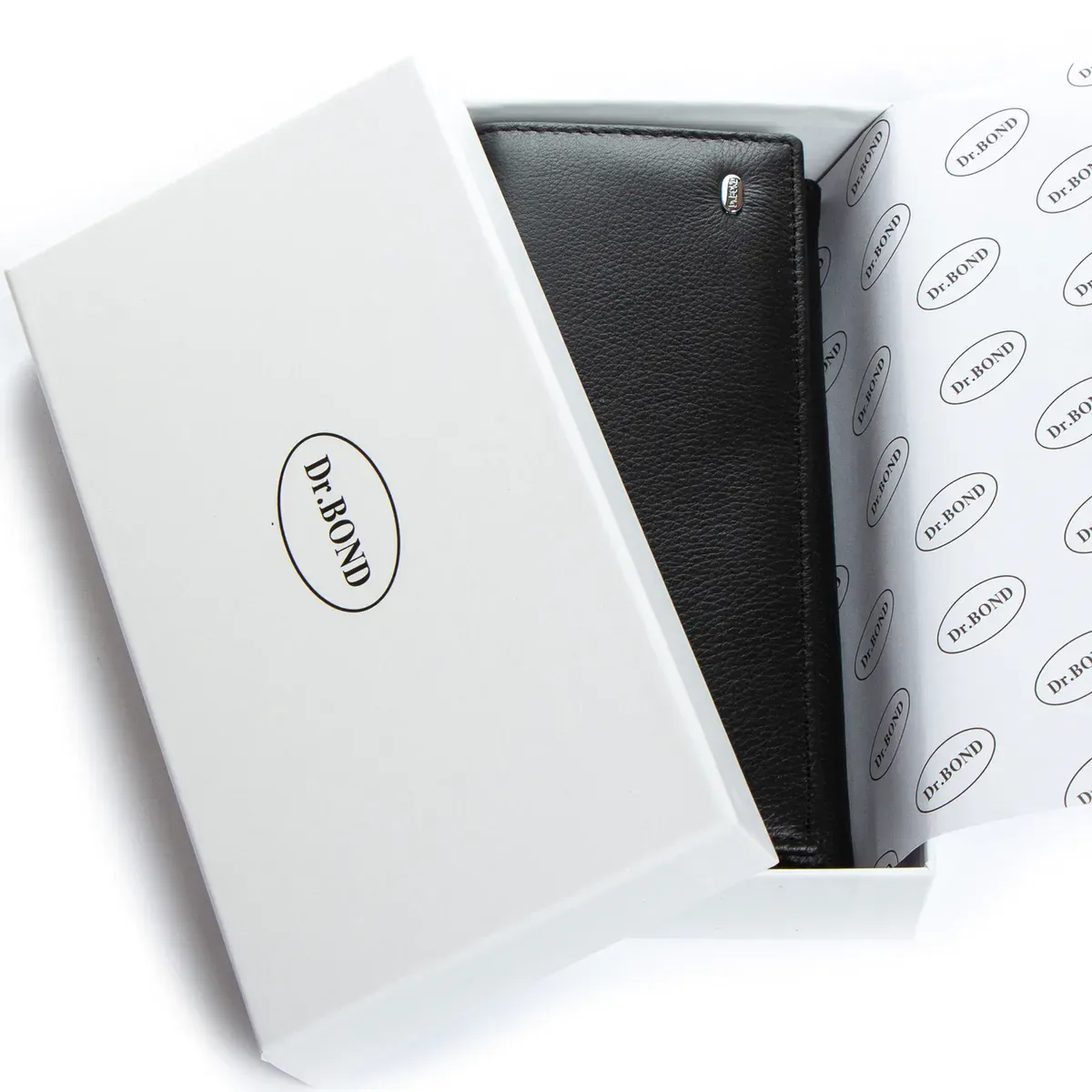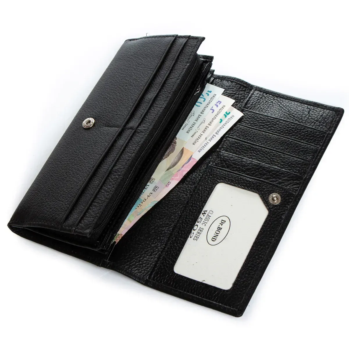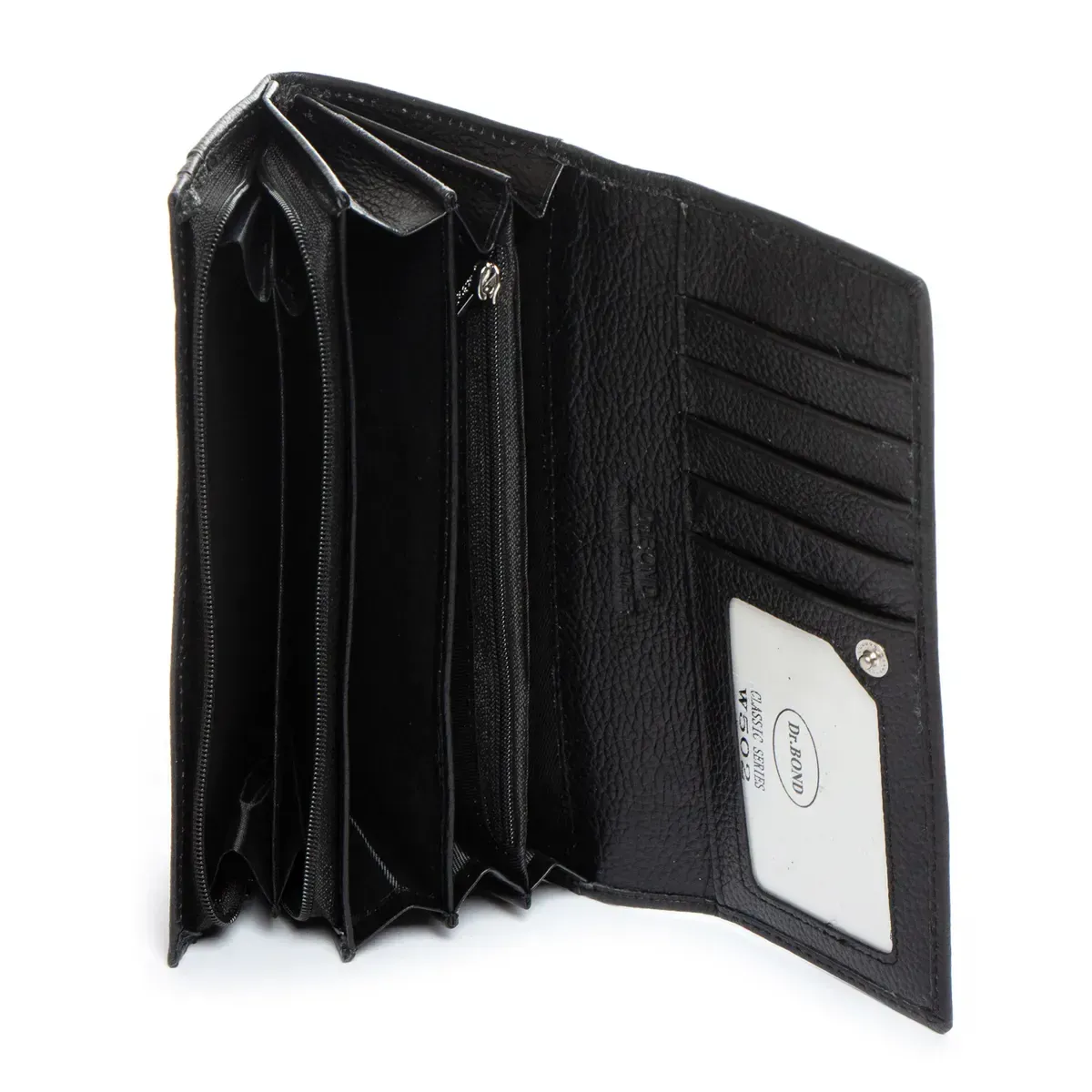 Великий полегшений жіночий гаманець DR. BOND. Виготовлений із натуральної м'якої шкіри з природною текстурою. Закривається кнопку. Усередині знаходяться 3 відкритих відділення для банкнот і одне подвійне відділення на блискавці, кишеня-монетниця на блискавці, велика відкрита кишеня та 9 кишень для карток та візиток. Зовні гаманця на звороті є кишеня на блискавці.