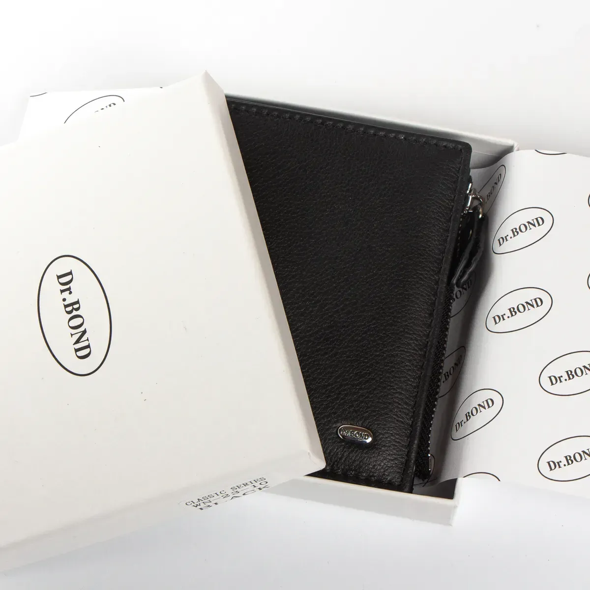 Жіночий шкіряний гаманець Dr.Bond. Складається вдвічі та закривається на кнопку. Усередині знаходяться: одне відкрите відділення для банкнот, 4 кишені для візитних карток та 3 великі кишені. Зовні гаманця є монетниця на блискавці.