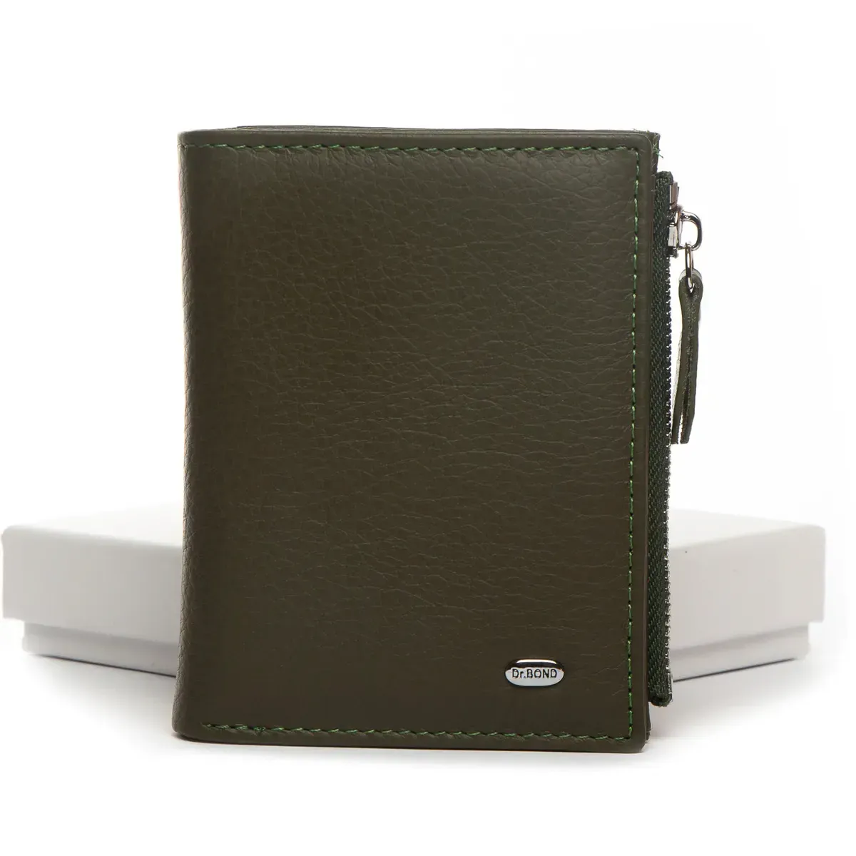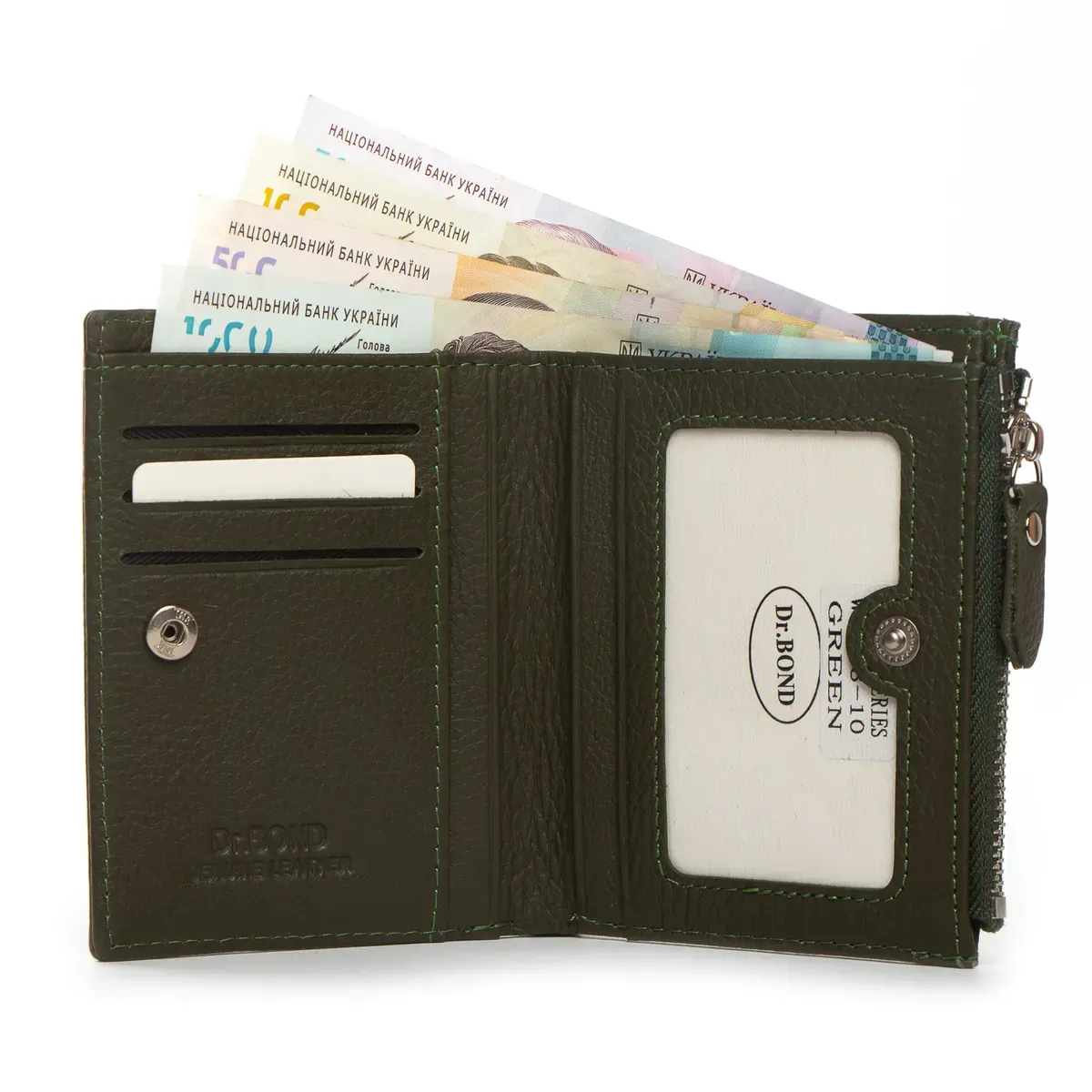 Жіночий шкіряний гаманець Dr.Bond. Складається вдвічі та закривається на кнопку. Усередині знаходяться: одне відкрите відділення для банкнот, 4 кишені для візитних карток та 3 великі кишені. Зовні гаманця є монетниця на блискавці.