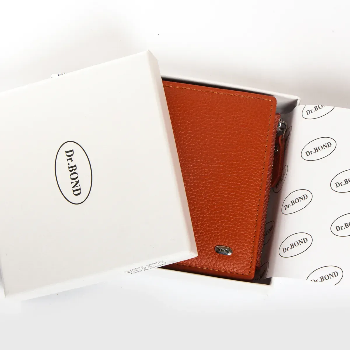 Жіночий шкіряний гаманець Dr.Bond. Складається вдвічі та закривається на кнопку. Усередині знаходяться: одне відкрите відділення для банкнот, 4 кишені для візитних карток та 3 великі кишені. Зовні гаманця є монетниця на блискавці.