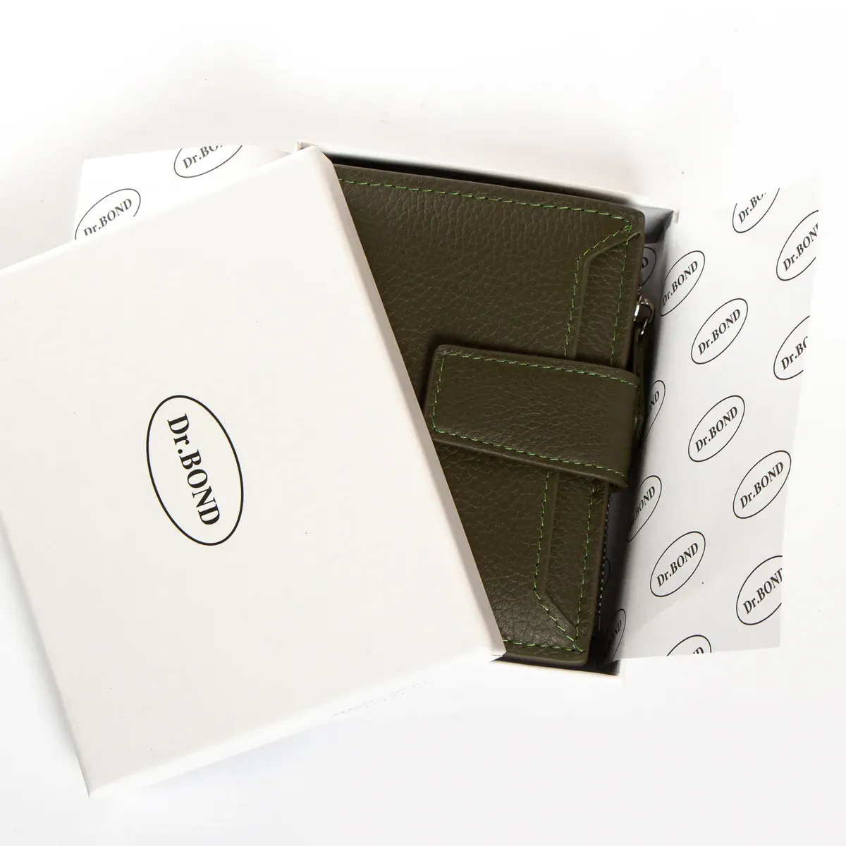 Жіночий шкіряний гаманець Dr.Bond. Закривається клапаном на кнопці. Усередині знаходяться два відкриті відділення для банкнот, 13 кишень для візитних карток. на відкидному блоці та 4 великі кишені. Зовні гаманця є монетниця на блискавці та відкрита кишеня на фасаді.
