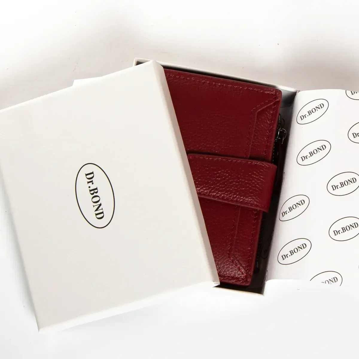 Жіночий шкіряний гаманець Dr.Bond. Закривається клапаном на кнопці. Усередині знаходяться два відкриті відділення для банкнот, 13 кишень для візитних карток. на відкидному блоці та 4 великі кишені. Зовні гаманця є монетниця на блискавці та відкрита кишеня на фасаді.