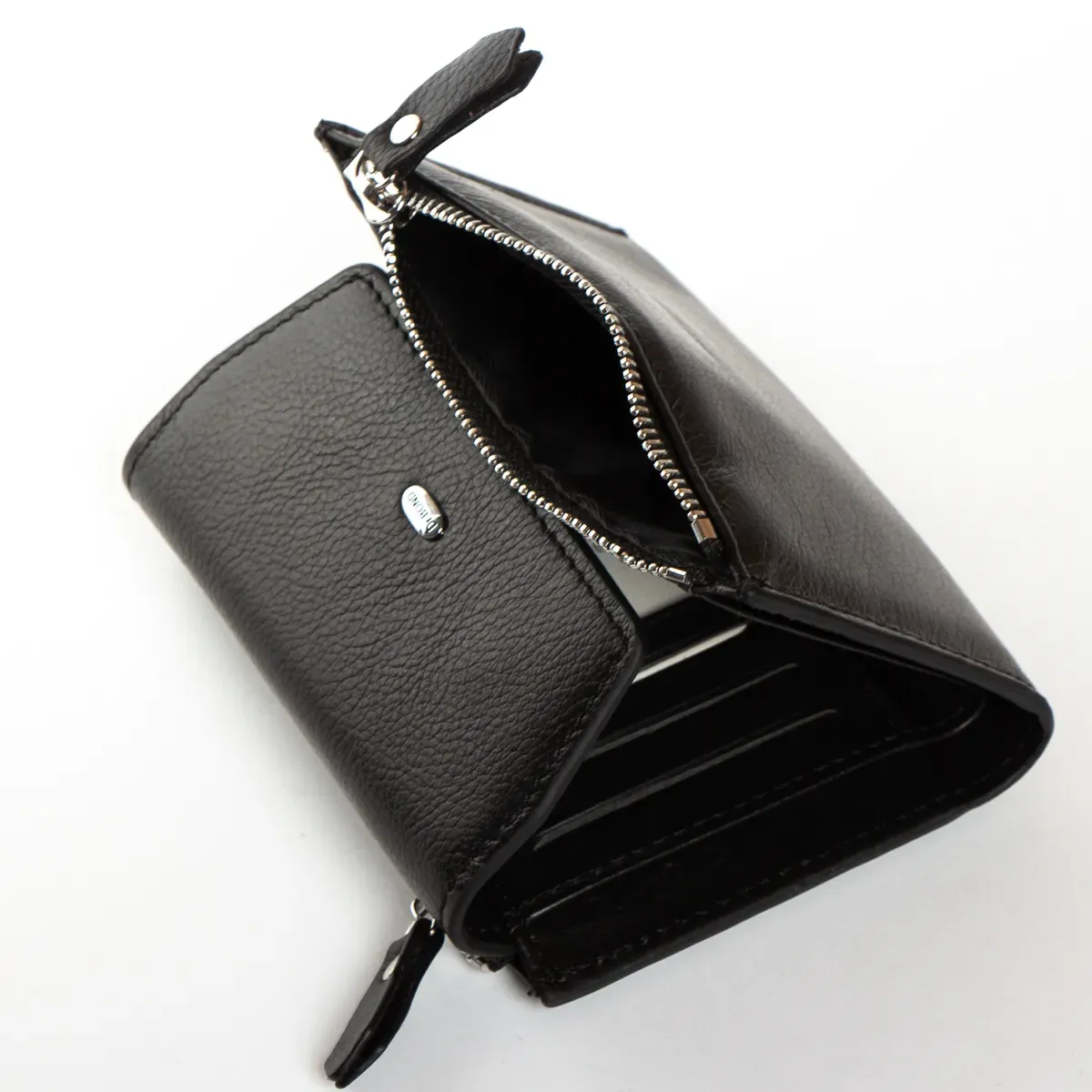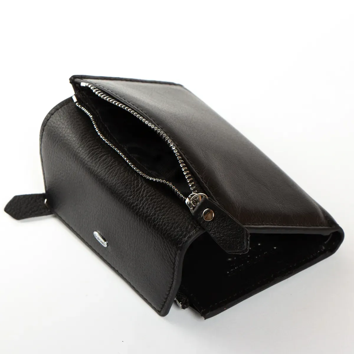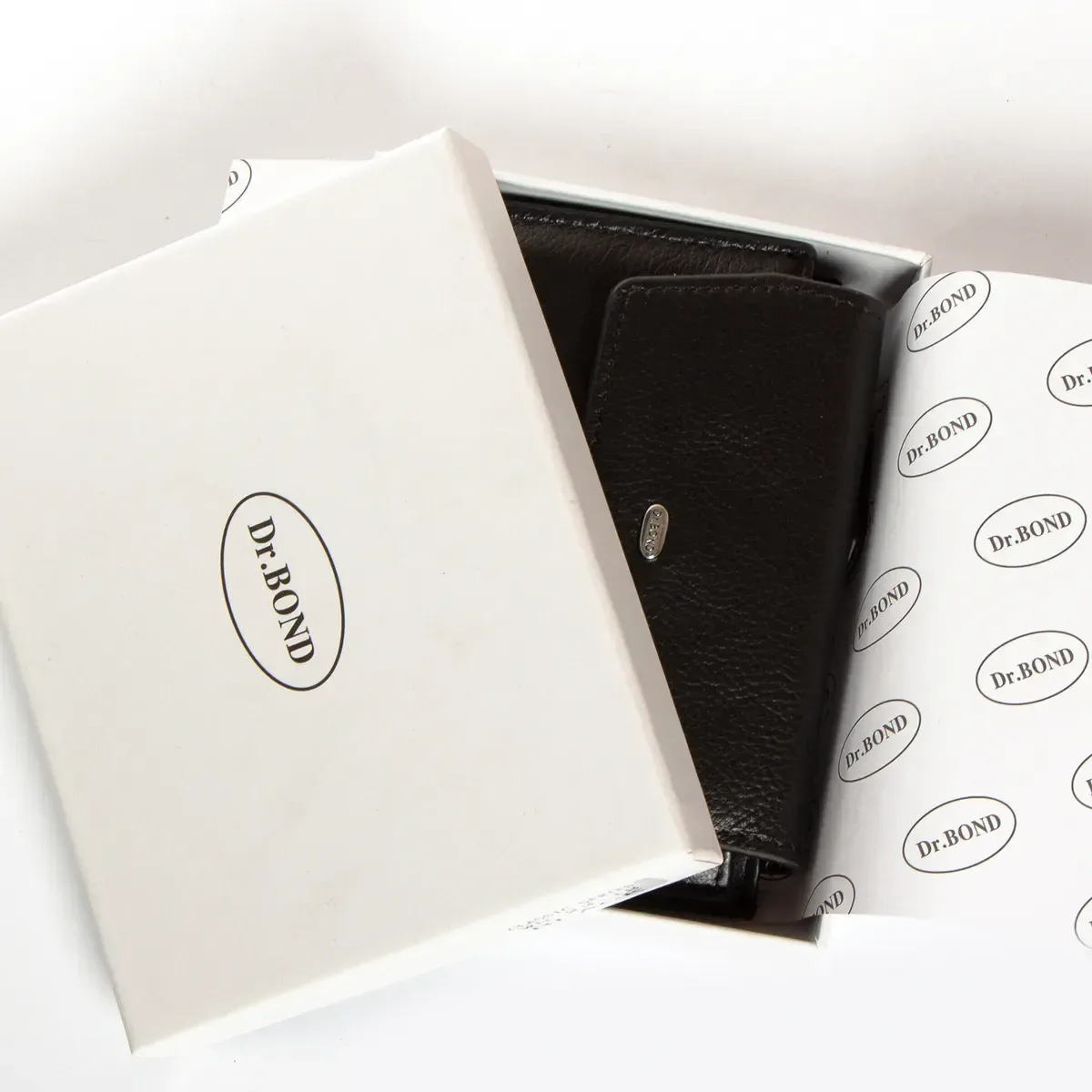 Жіночий шкіряний гаманець Dr.Bond. Складається вдвічі та закривається великим клапаном на прихованому магніті. Усередині знаходяться: одне відкрите відділення для банкнот, 7 кишень для візитних карток, 2 великі кишені та кишеня-монетниця на блискавці. Зовні гаманця є ще одна монетниця на блискавці.