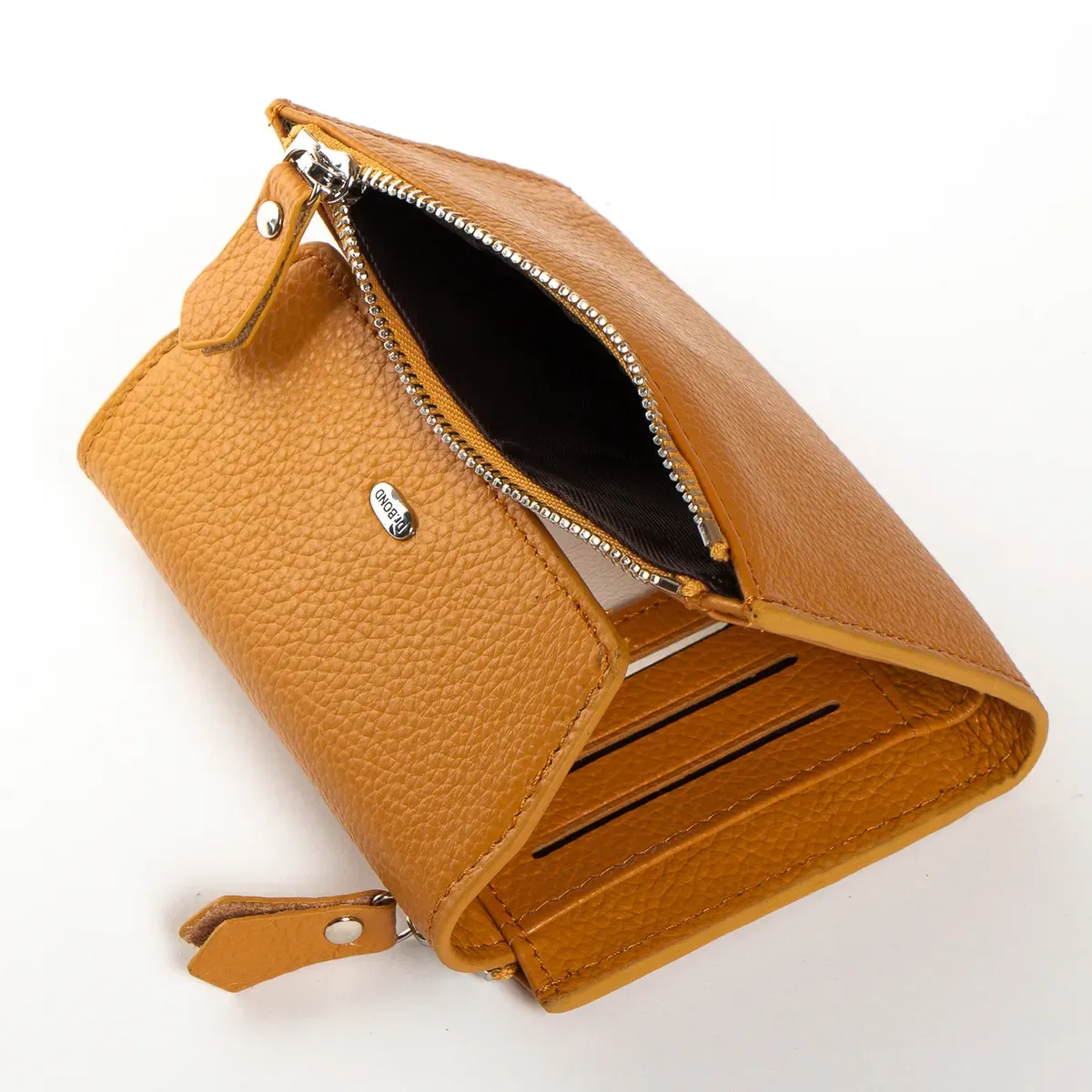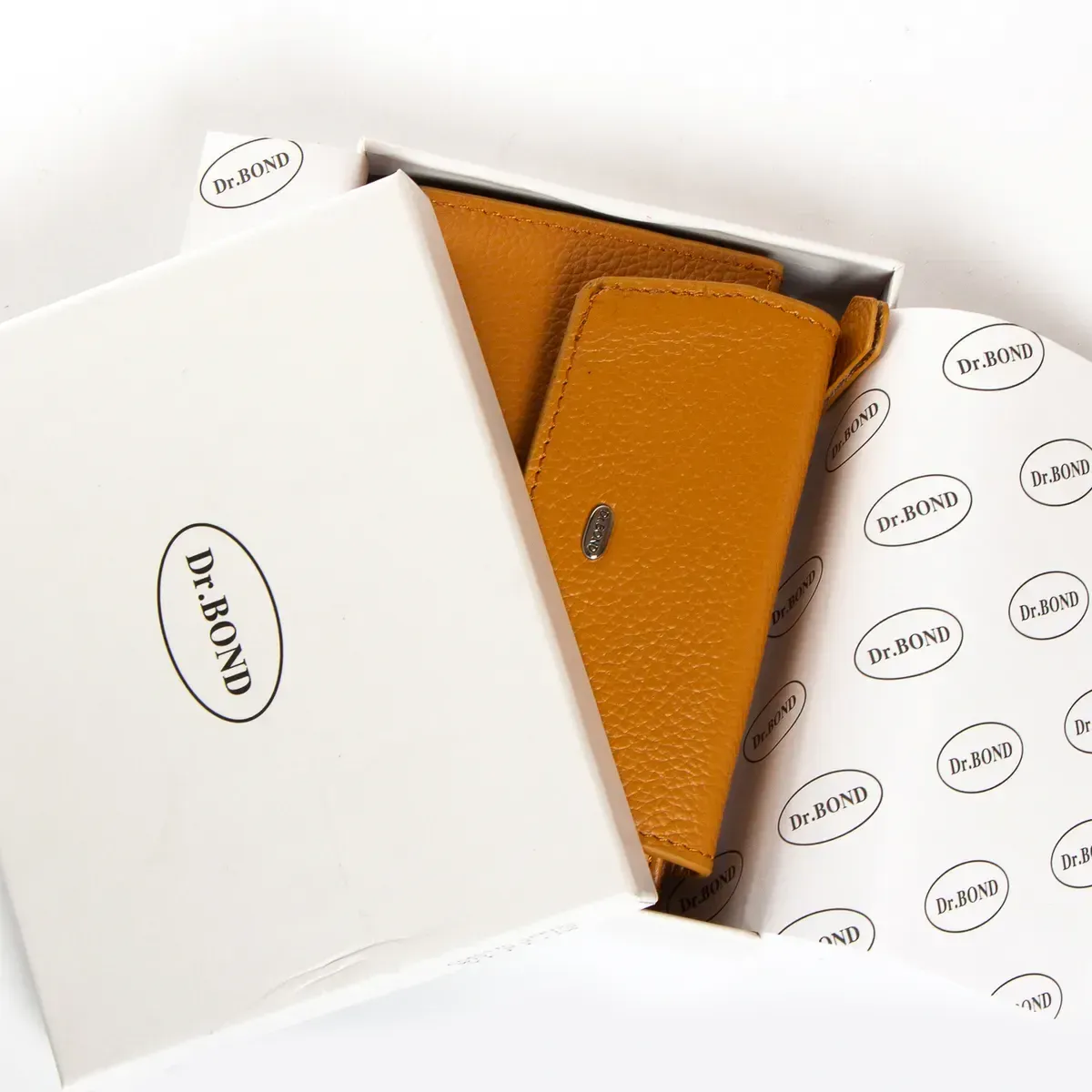 Жіночий шкіряний гаманець Dr.Bond. Складається вдвічі та закривається великим клапаном на прихованому магніті. Усередині знаходяться: одне відкрите відділення для банкнот, 7 кишень для візитних карток, 2 великі кишені та кишеня-монетниця на блискавці. Зовні гаманця є ще одна монетниця на блискавці.