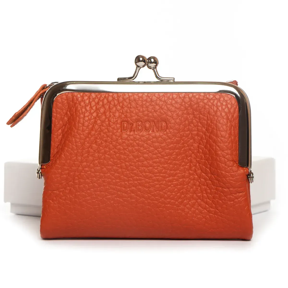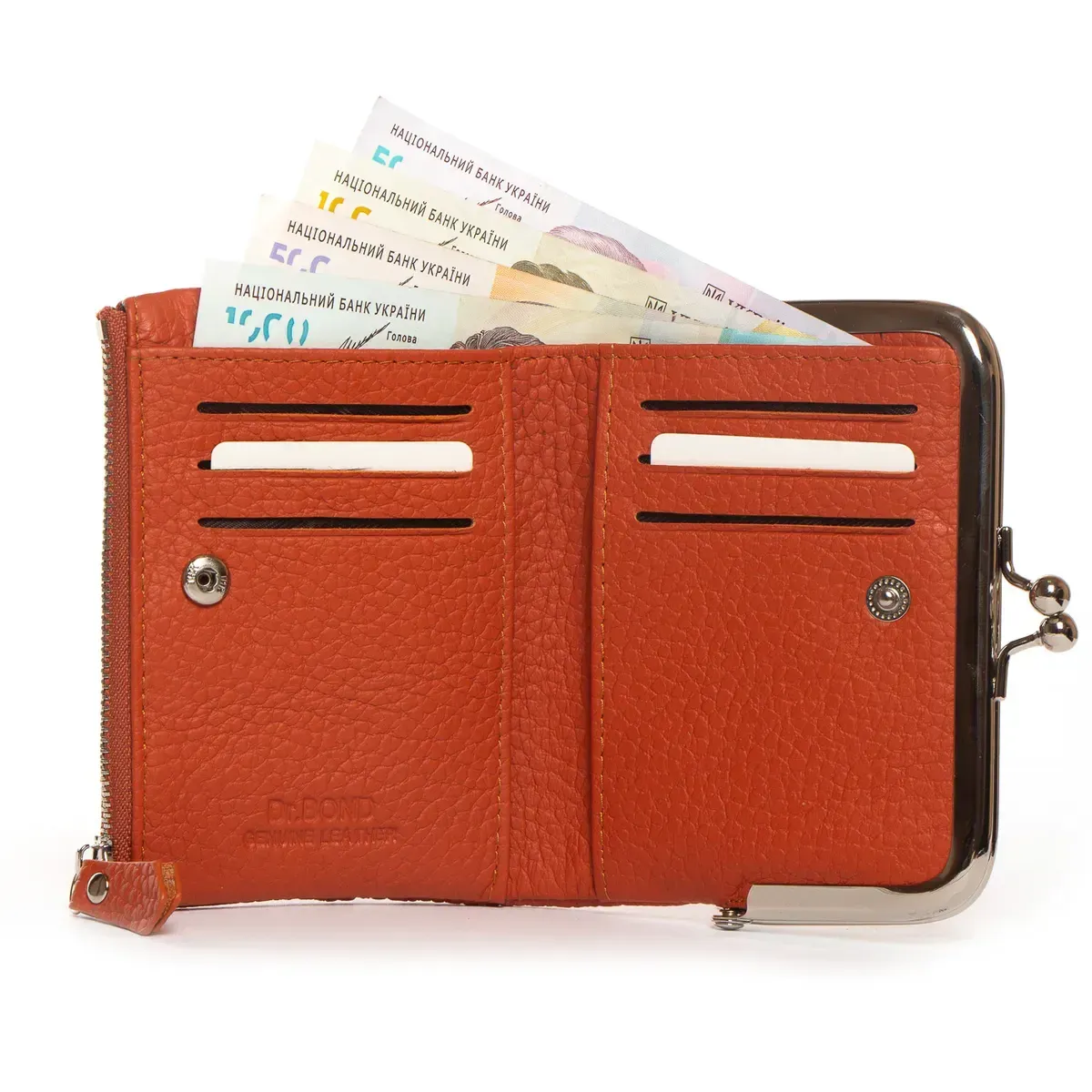 Жіночий шкіряний гаманець Dr.Bond. Складається вдвічі та закривається на кнопку. Усередині знаходяться: одне відкрите відділення для банкнот, 6 кишень для візитних карток та 2 великі кишені. Зовні гаманця є дві монетниці, одна на клямці, а інша закривається на блискавку.