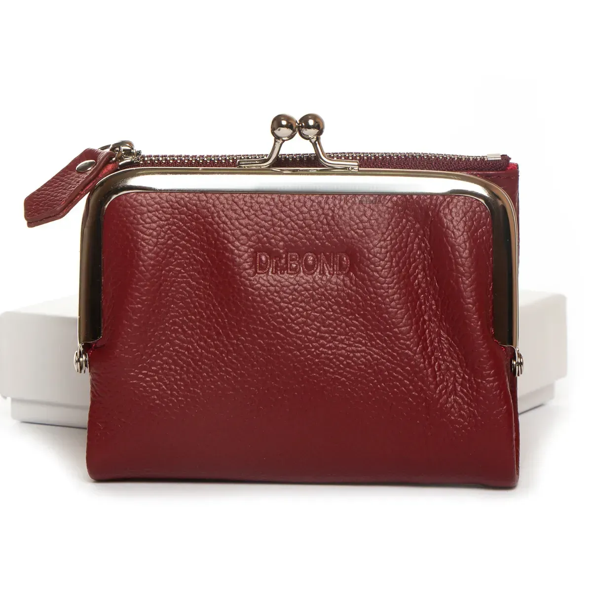 Жіночий шкіряний гаманець Dr.Bond. Складається вдвічі та закривається на кнопку. Усередині знаходяться: одне відкрите відділення для банкнот, 6 кишень для візитних карток та 2 великі кишені. Зовні гаманця є дві монетниці, одна на клямці, а інша закривається на блискавку.