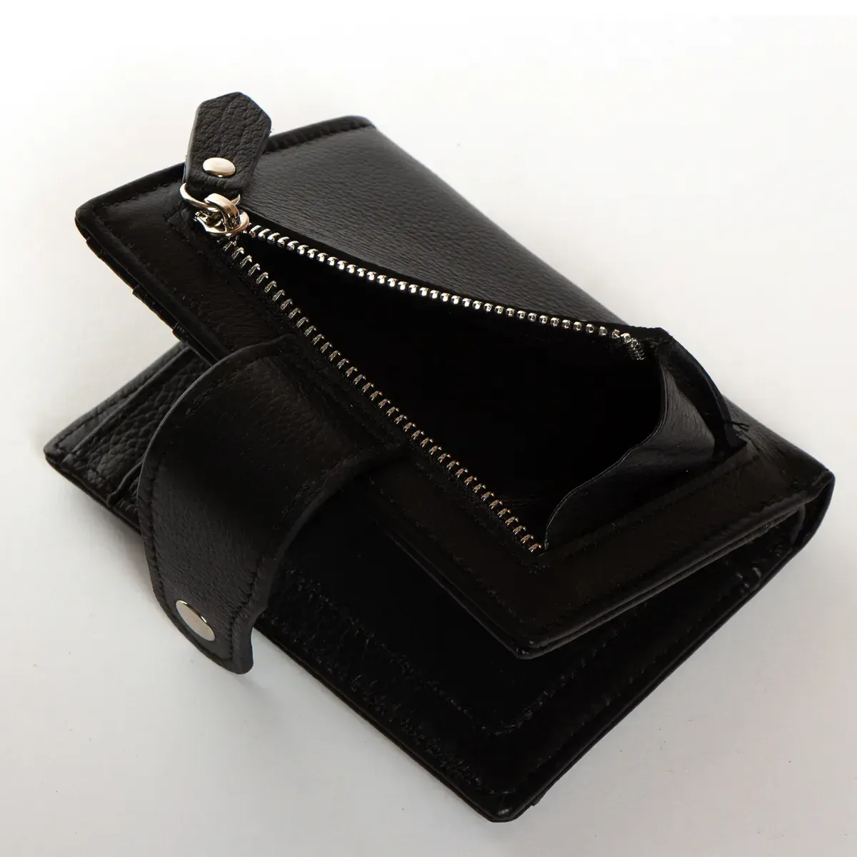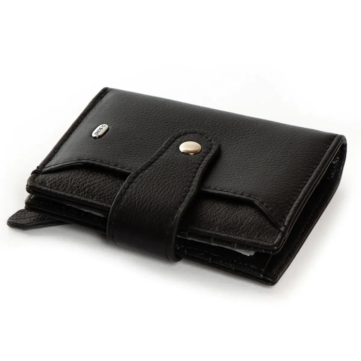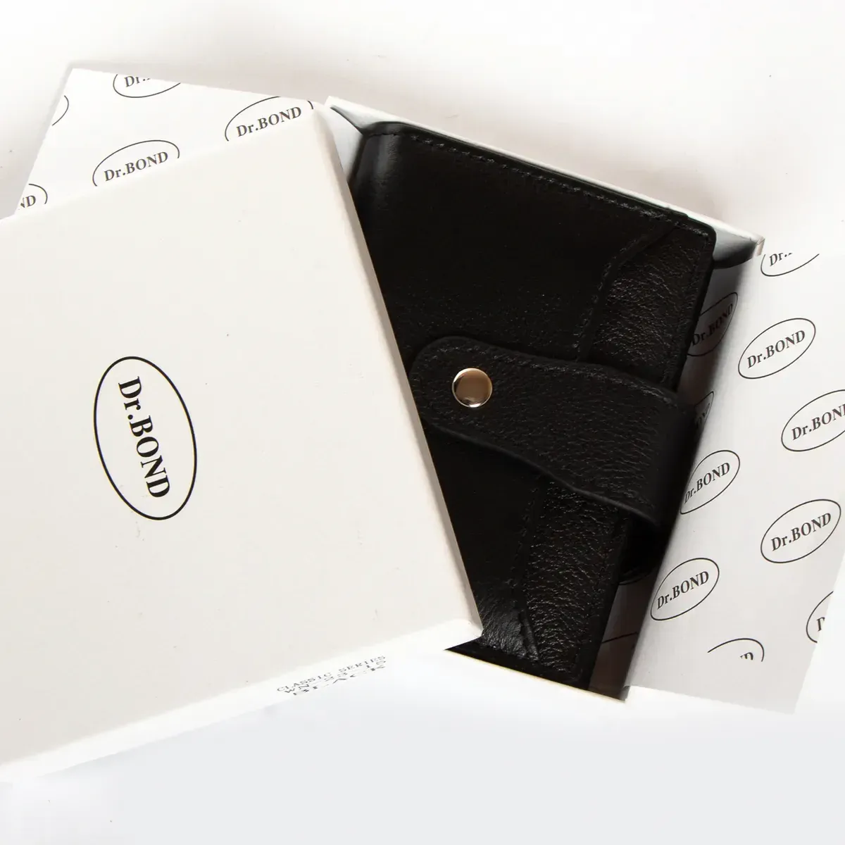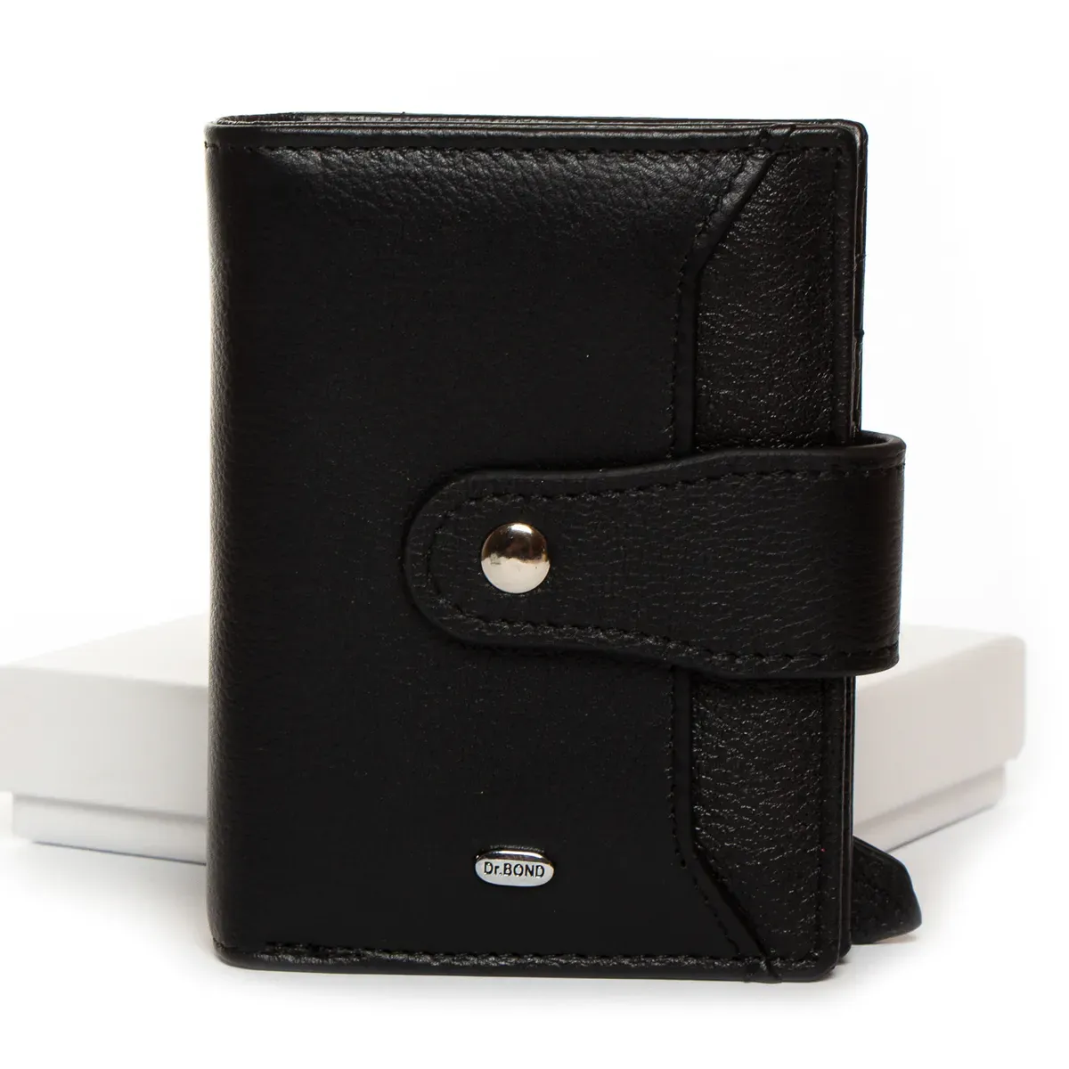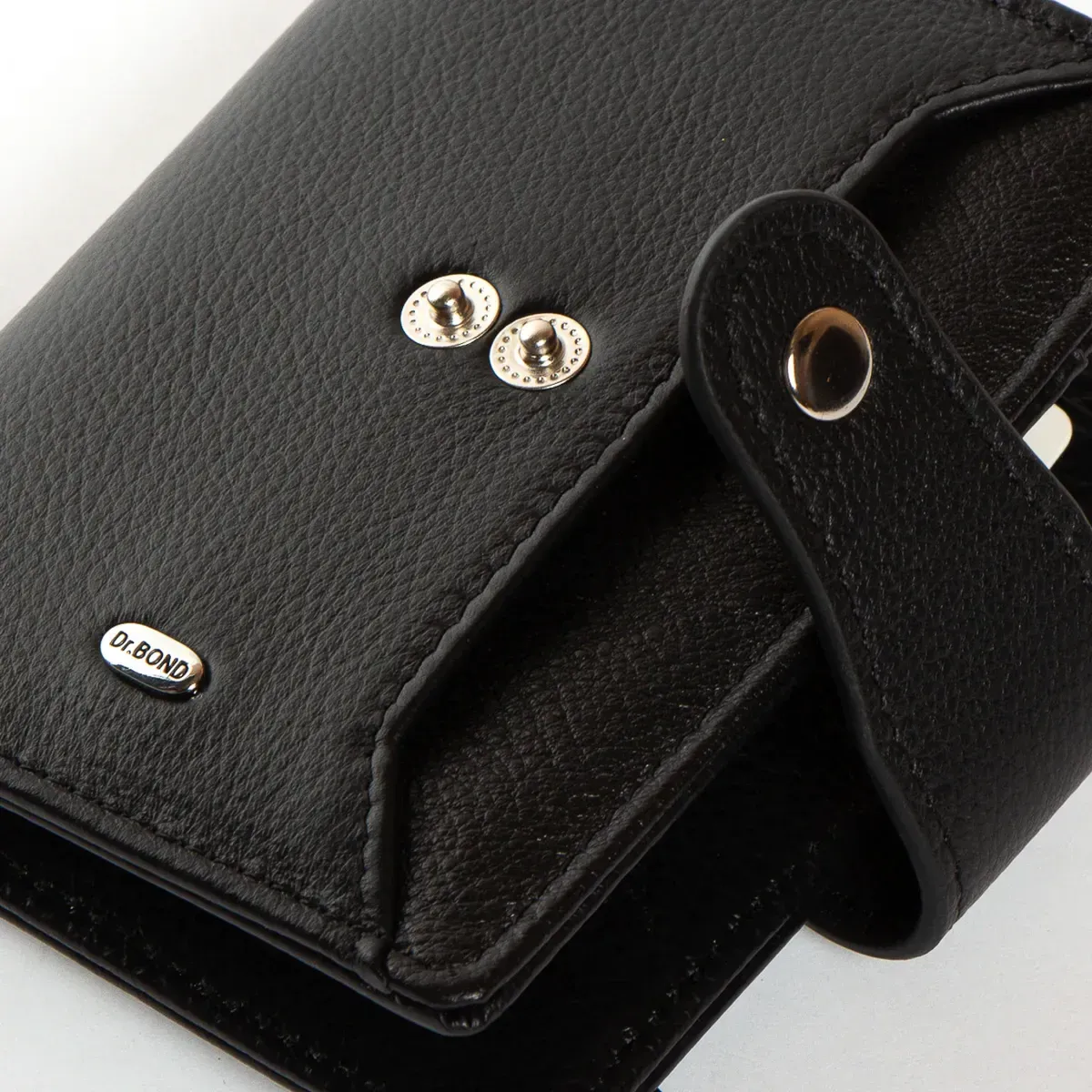 Жіночий шкіряний гаманець Dr.Bond. Складається вдвічі та закривається клапаном на кнопці. Усередині знаходяться: два відкритих відділення для банкнот, 6 кишень для візитних карток та 4 великі кишені. Зовні гаманця на звороті є монетниця на блискавці, а на фасаді відкрита плоска кишеня.