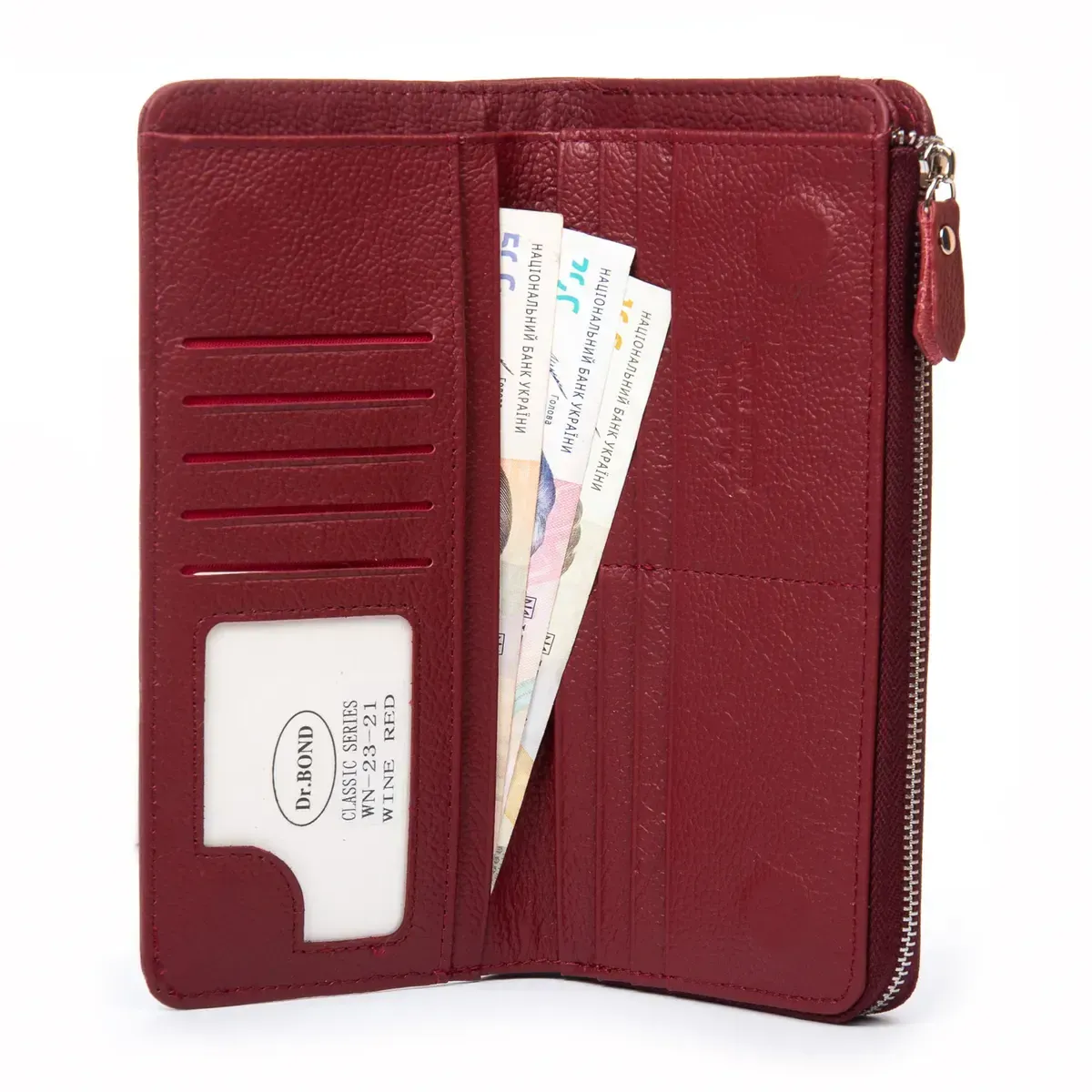 Великий жіночий гаманець Dr.Bond. Виготовлений із натуральної м'якої шкіри. Подвійне відділення для банкнот закривається на блискавку та розділене всередині великою монетницею на блискавці. У другому блоці, який закривається на два приховані магніти, є 11 кишень для візитних карток, три великі кишені та одне велике відділення для банкнот.