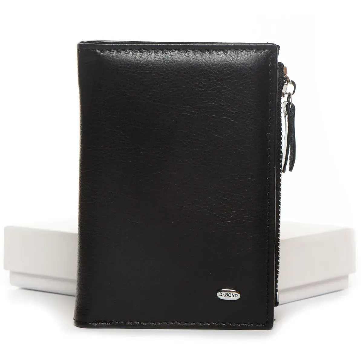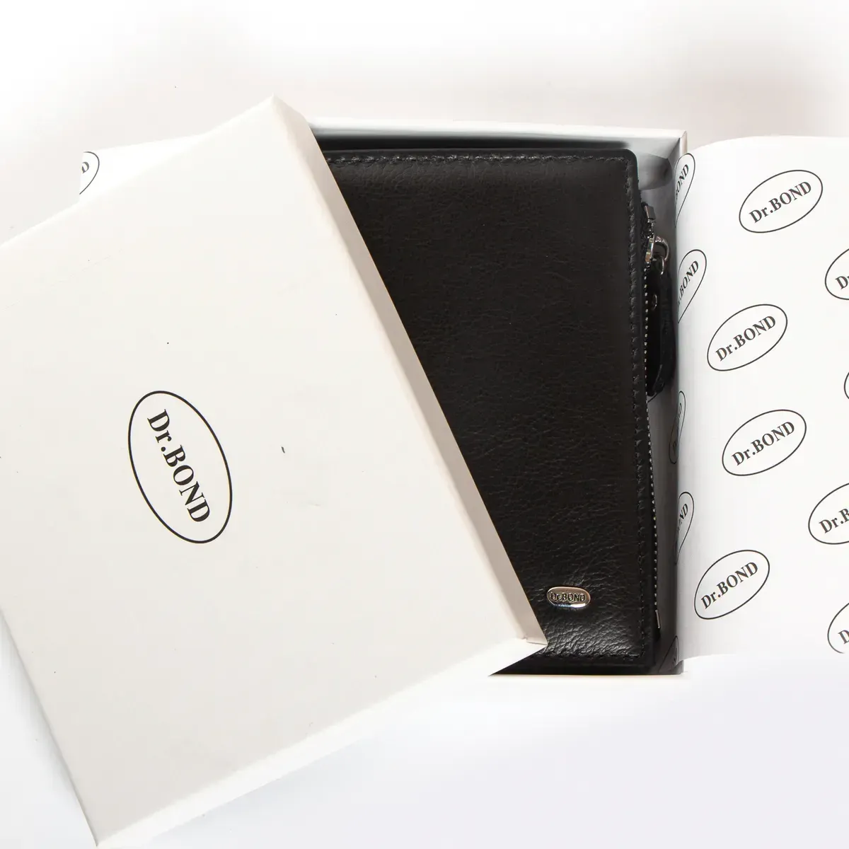 Жіночий полегшений шкіряний гаманець Dr.Bond. Складається вдвічі та закривається на кнопку. Усередині знаходяться: одне відкрите відділення для банкнот, 4 кишені для візитних карток та 2 великі кишені. Зовні гаманця є монетниця на блискавці.