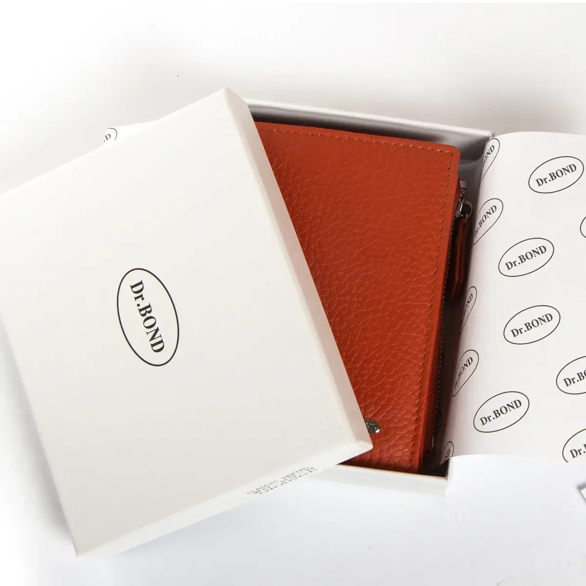 Жіночий полегшений шкіряний гаманець Dr.Bond. Складається вдвічі та закривається на кнопку. Усередині знаходяться: одне відкрите відділення для банкнот, 4 кишені для візитних карток та 2 великі кишені. Зовні гаманця є монетниця на блискавці.