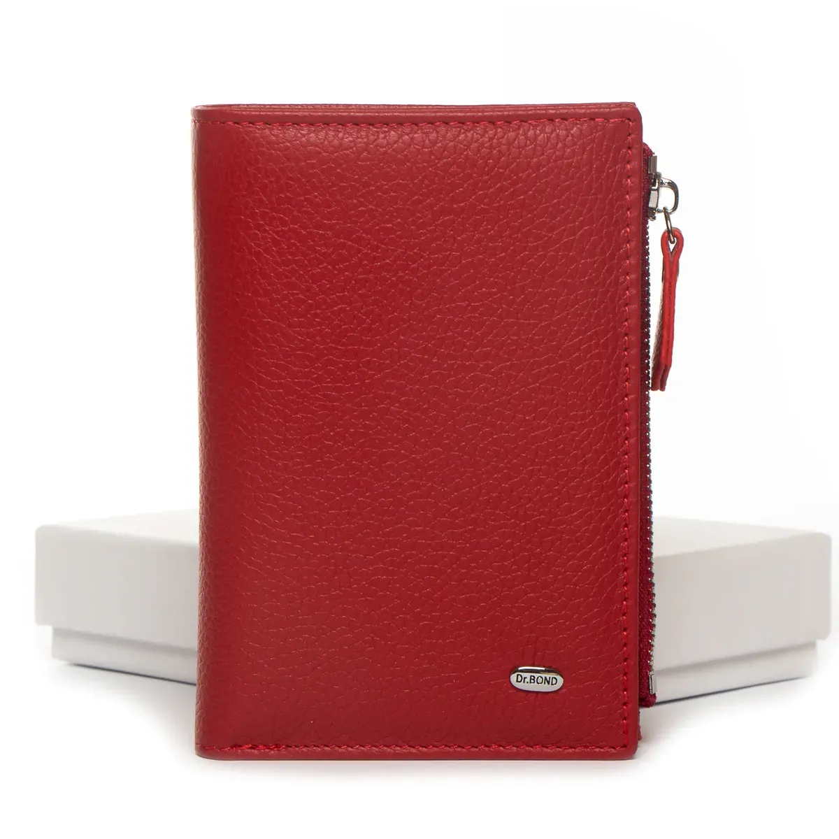 Жіночий полегшений шкіряний гаманець Dr.Bond. Складається вдвічі та закривається на кнопку. Усередині знаходяться: одне відкрите відділення для банкнот, 4 кишені для візитних карток та 2 великі кишені. Зовні гаманця є монетниця на блискавці.