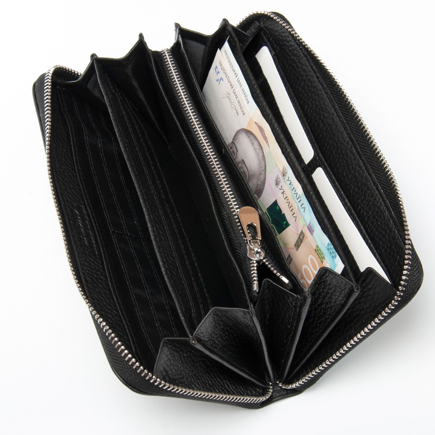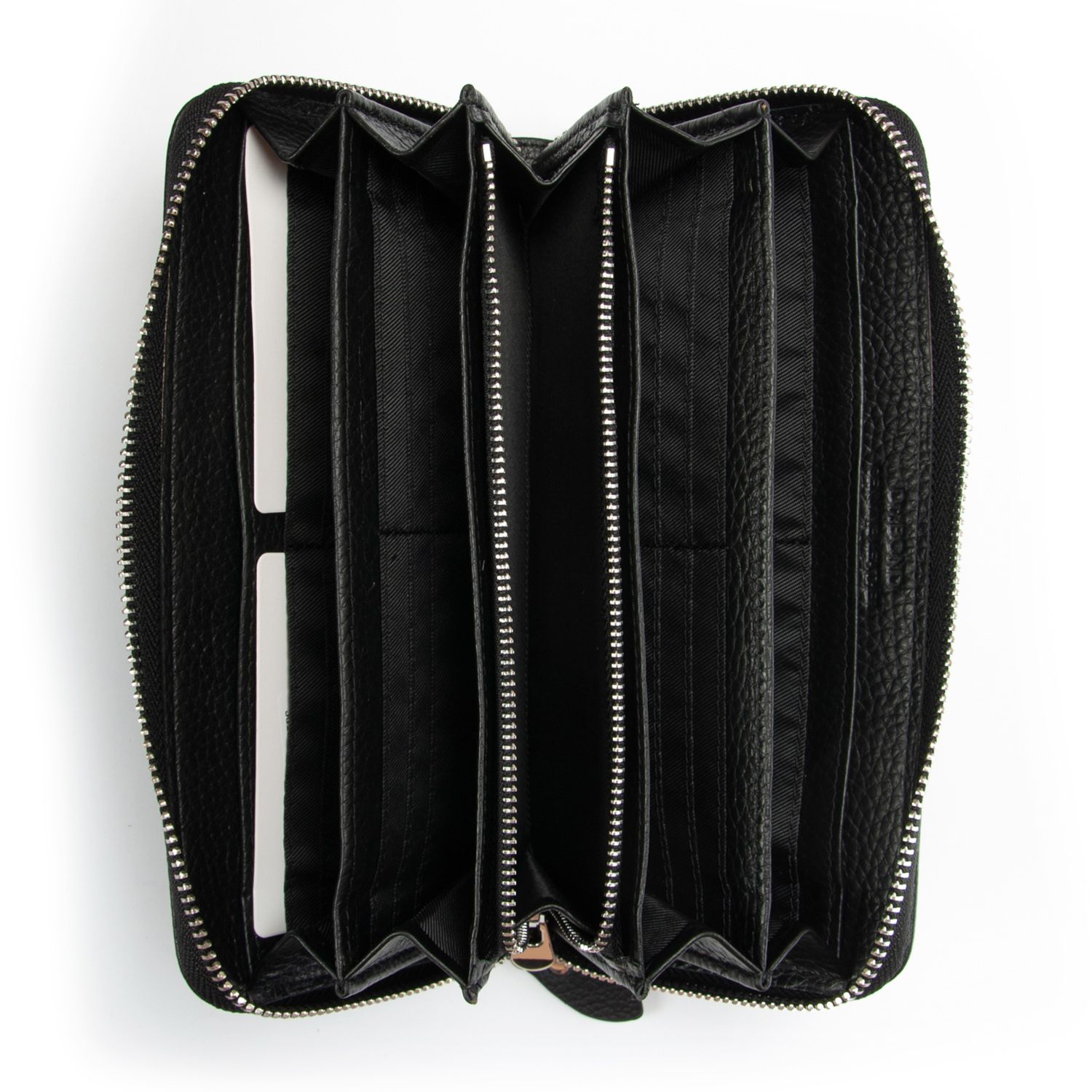 Закрывается на молнию. Внутри есть 4 отделения для банкнот, карман-перегордка для мелочи на молнии, 2 больших открытых кармана и 36 карманов для визитных карт.