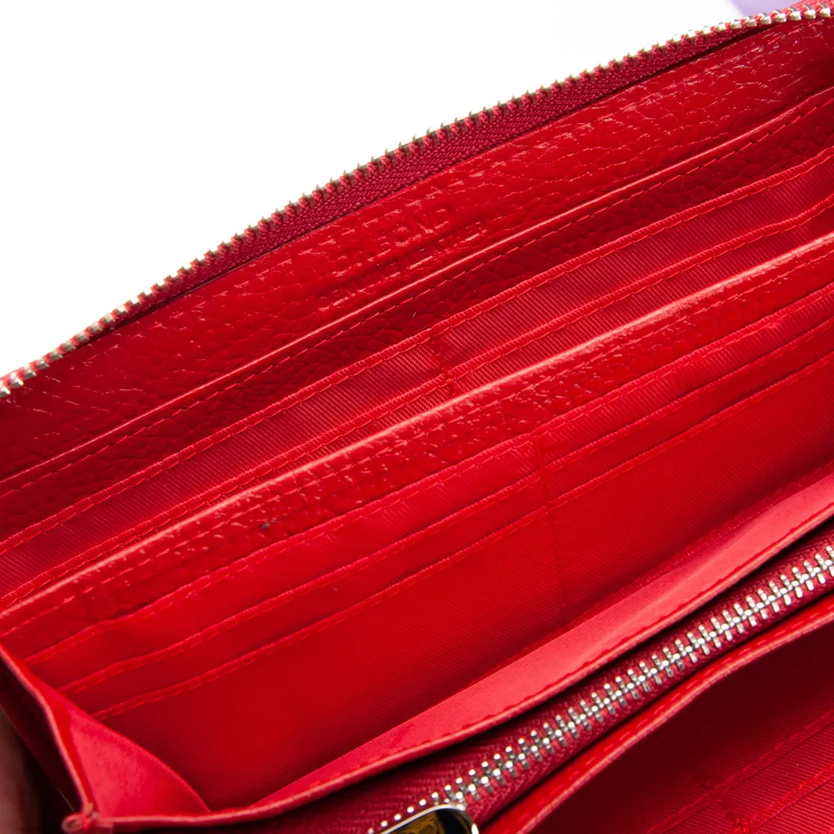 Закрывается на молнию. Внутри есть 4 отделения для банкнот, карман-перегордка для мелочи на молнии, 2 больших открытых кармана и 36 карманов для визитных карт.