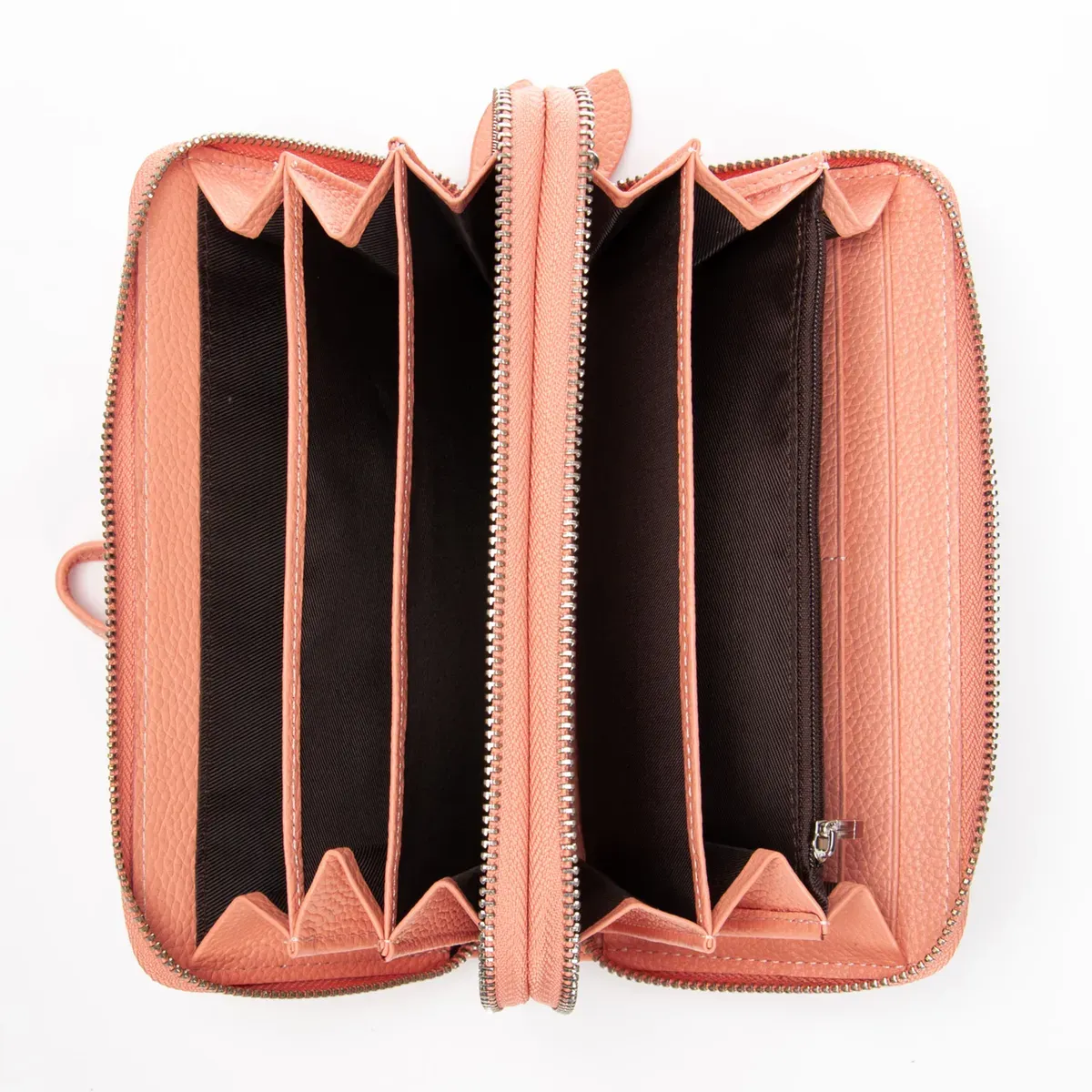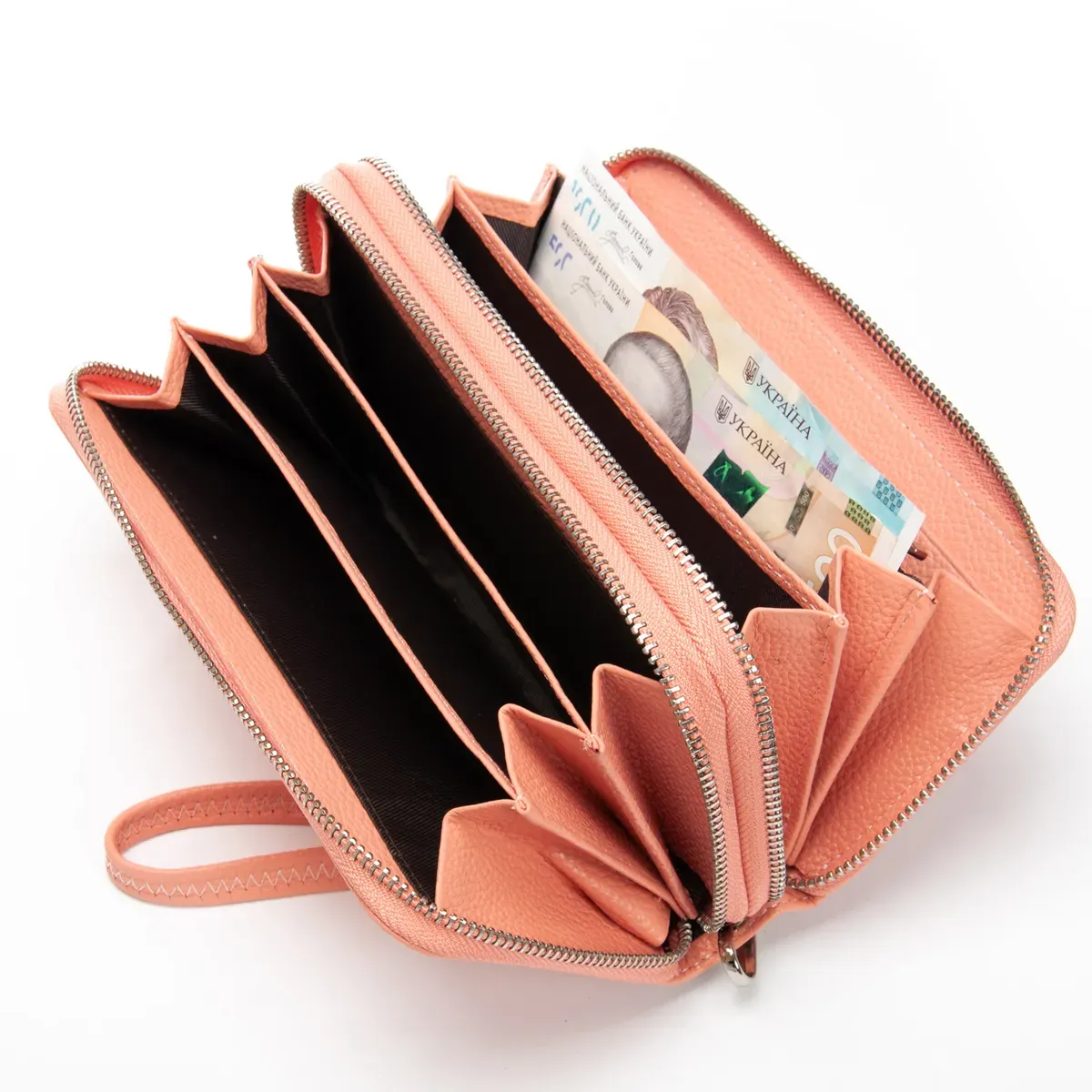 Два отделения, закрываются на молнию. Внутри каждого отделения есть 3 кармана для банкнот. В переднем отделении также находится карман для мелочи на молнии, два больших открытых кармана и 8 карманов для визитных карт.