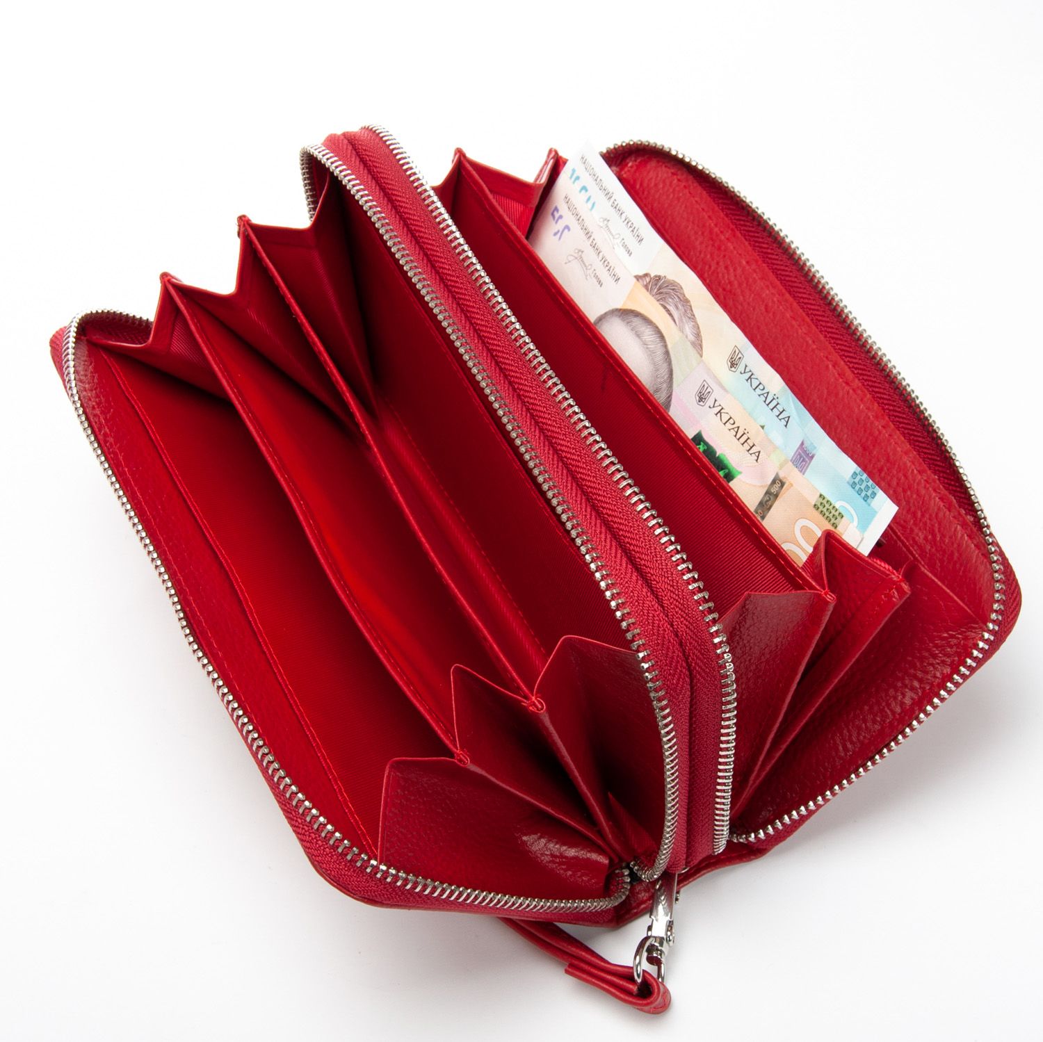 Два отделения, закрываются на молнию. Внутри каждого отделения есть 3 кармана для банкнот. В переднем отделении также находится карман для мелочи на молнии, два больших открытых кармана и 8 карманов для визитных карт.