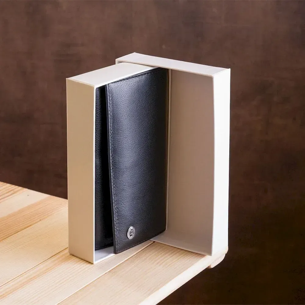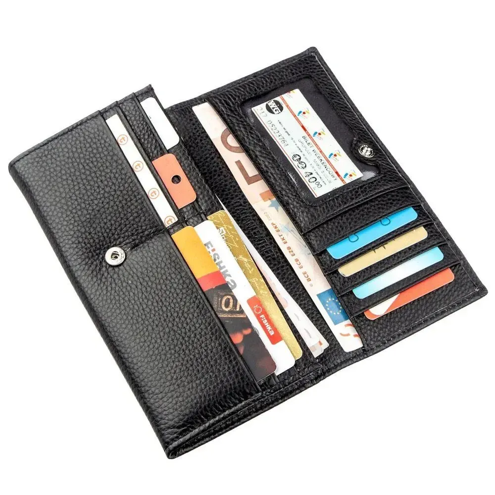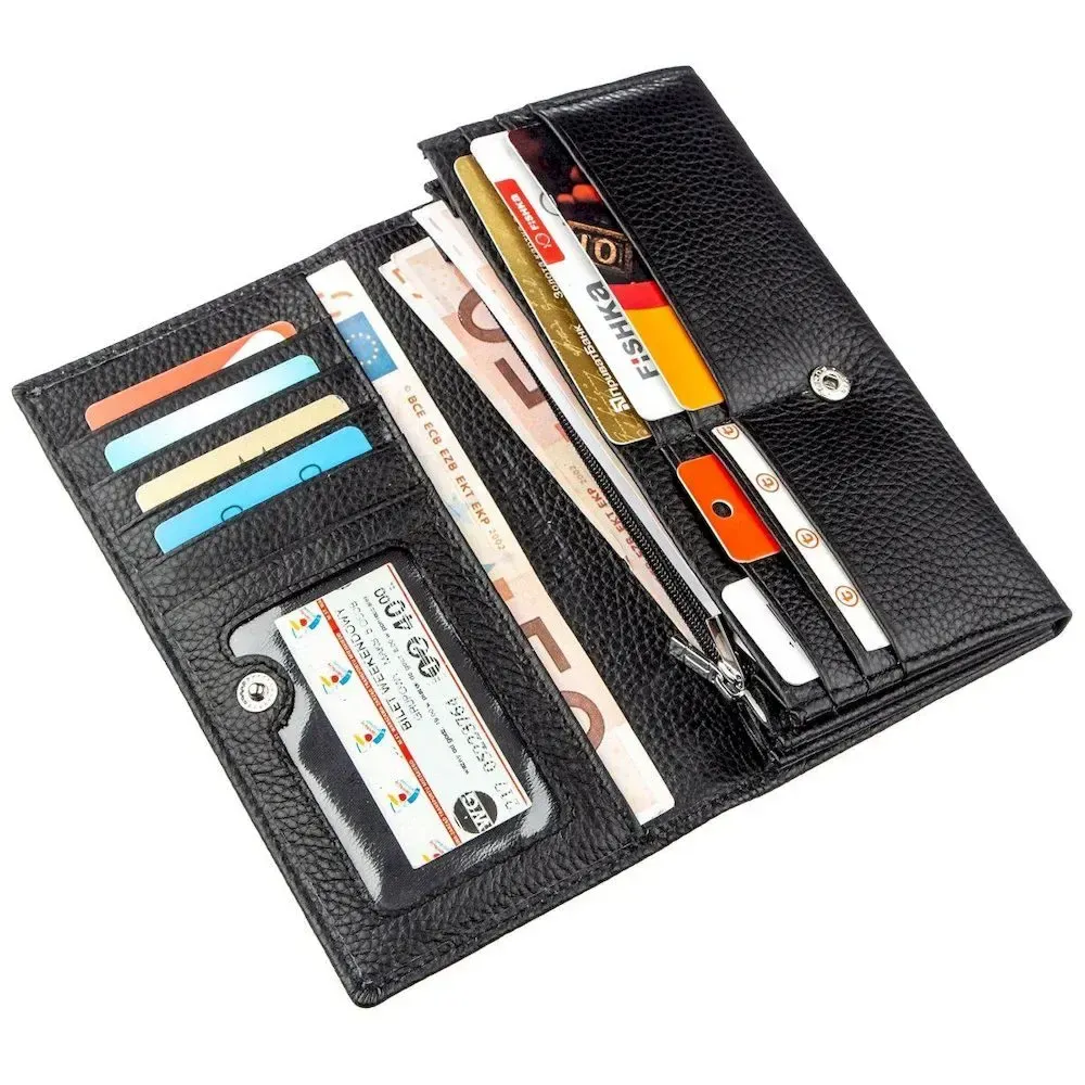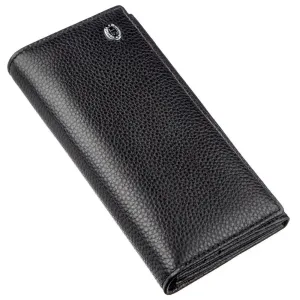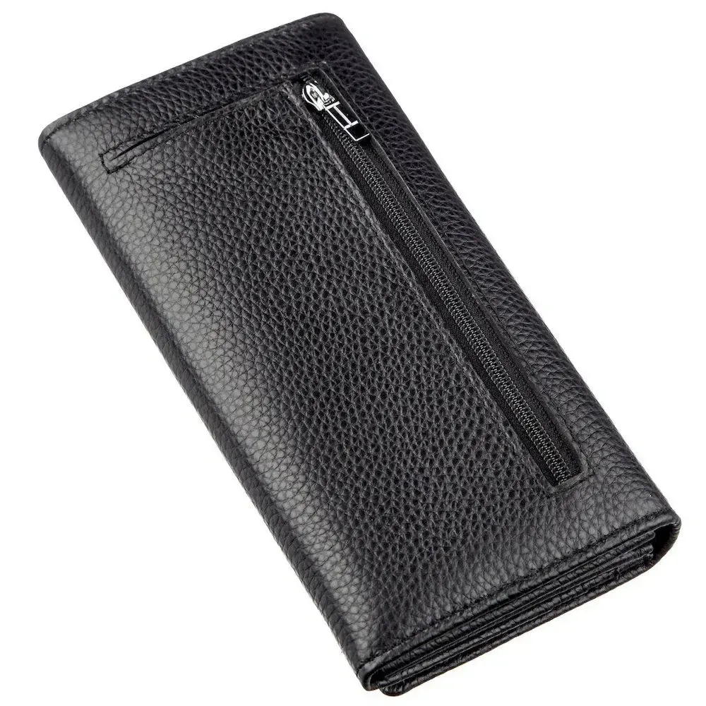 Чудовий жіночий гаманець з натуральної шкіри першокласної якості. Має ніжну зернисту фактуру, яка приємна на дотик і виглядає дуже гідно та багато. Колір – матовий чорний, що в наш час модно і практично. Гаманець має три великі основні відділення для купюр, відділення для особливо цінних речей на блискавці, відділення для карт та фото. На зовнішній стороні гаманця розташоване відділення для монет або інших дрібниць, що сприяє швидшому доступу до них. Такий гаманець стане чудовим подарунком коханій жінці, подрузі чи колезі по роботі. Запакований аксесуар у тверду білу коробку.