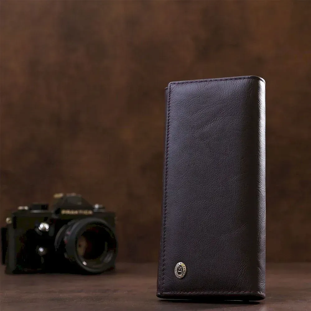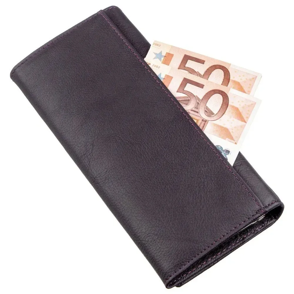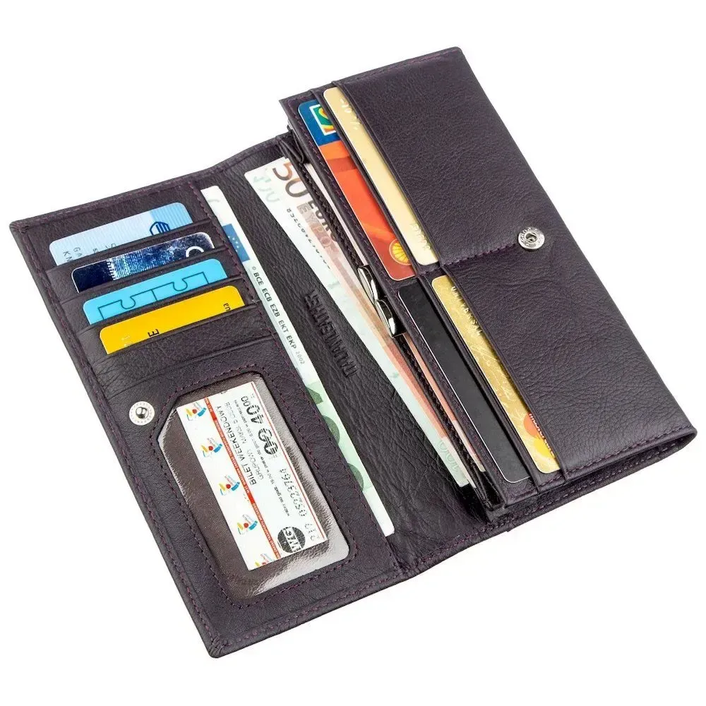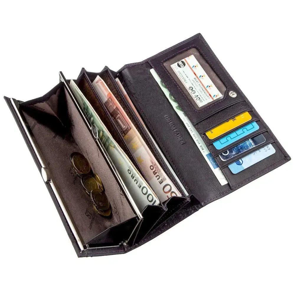 /> - зовнішнє потаємне відділення на всю довжину; Розкішний жіночий гаманець дивовижного темно-фіолетового кольору з матовим відтінком. Матеріал виконання – першосортна натуральна шкіра з найдостойнішими експлуатаційними властивостями. Дизайн гаманця досить стриманий, але водночас ефектний. Усередині є достатня кількість усіх необхідних у сучасних умовах відділень та кишень, також є монетниця на зручній клямці. Закривається гаманець на одну кнопку, що легко та практично. Купуючи аксесуар, він упаковується у фірмову картонну коробку з логотипом виробника.