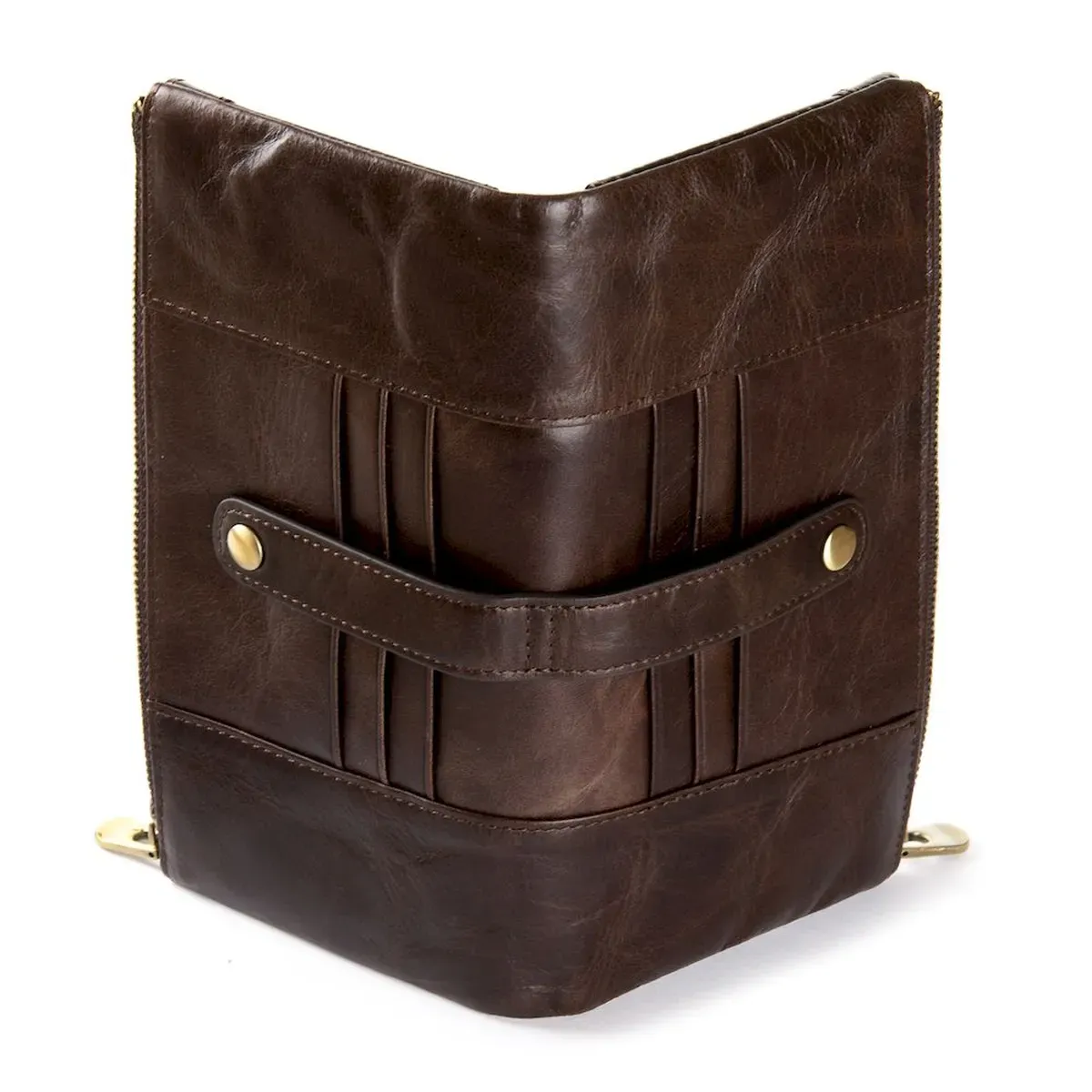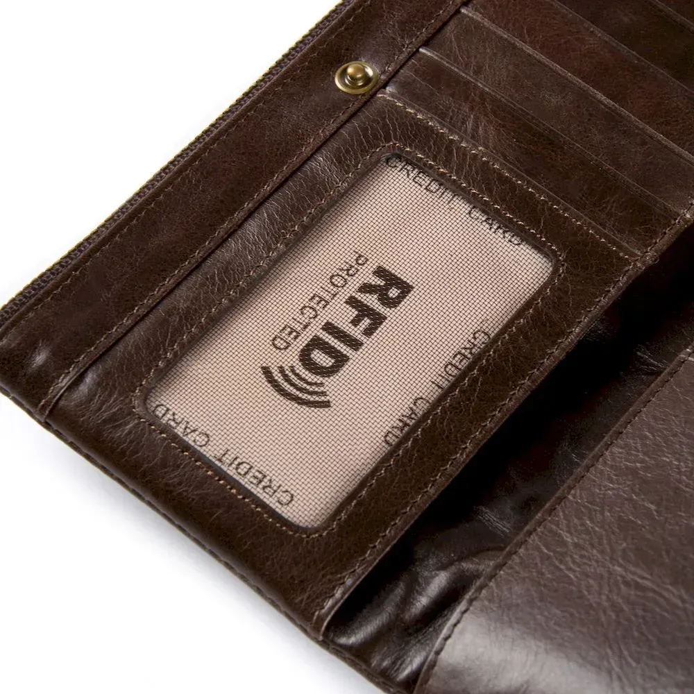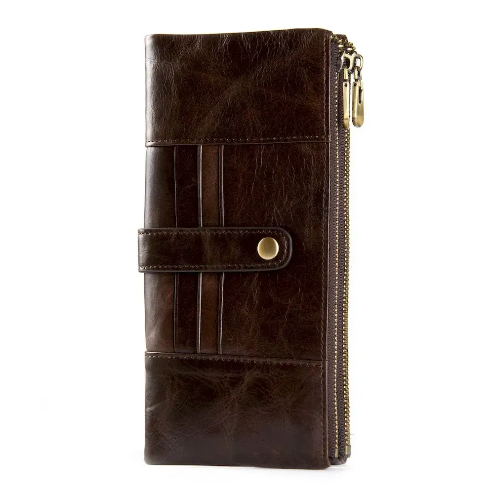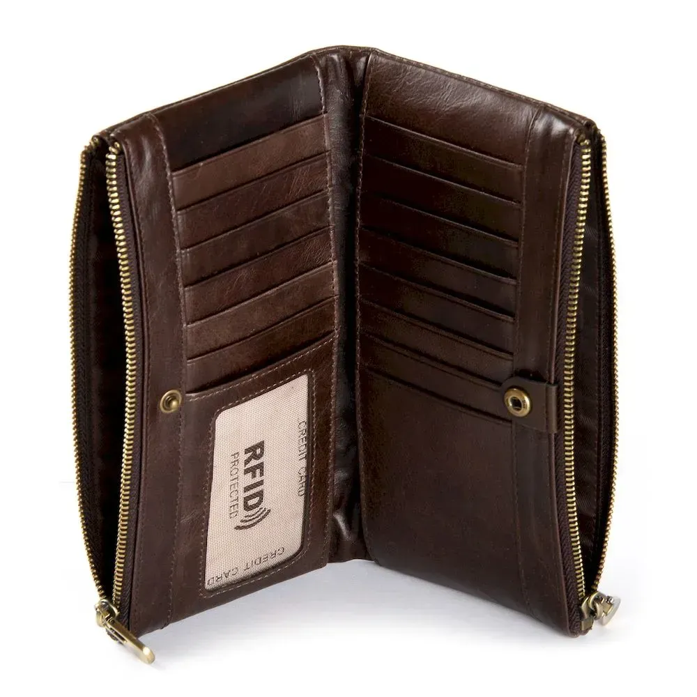 Жіночий гаманець. Виготовлений із натуральної м'якої шкіри. Закривається кнопку. Усередині 2 кишені для банкнот та 14 кишень для візиток та карт. Також усередині знаходиться дві кишені для флешкарт. Присутні для кишені для банкнот, що закриваються на блискавку. Зовні на задній частині знаходиться кишеня для монет, що застібається на блискавку.