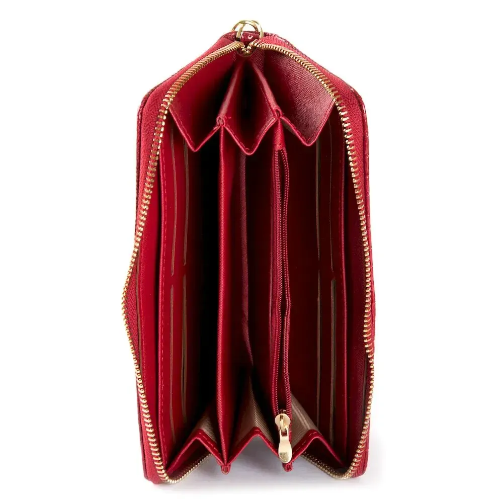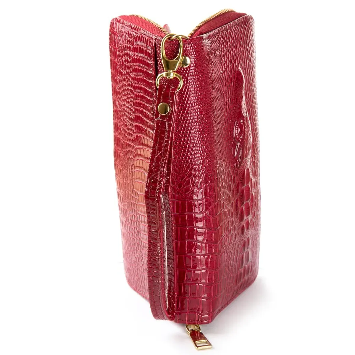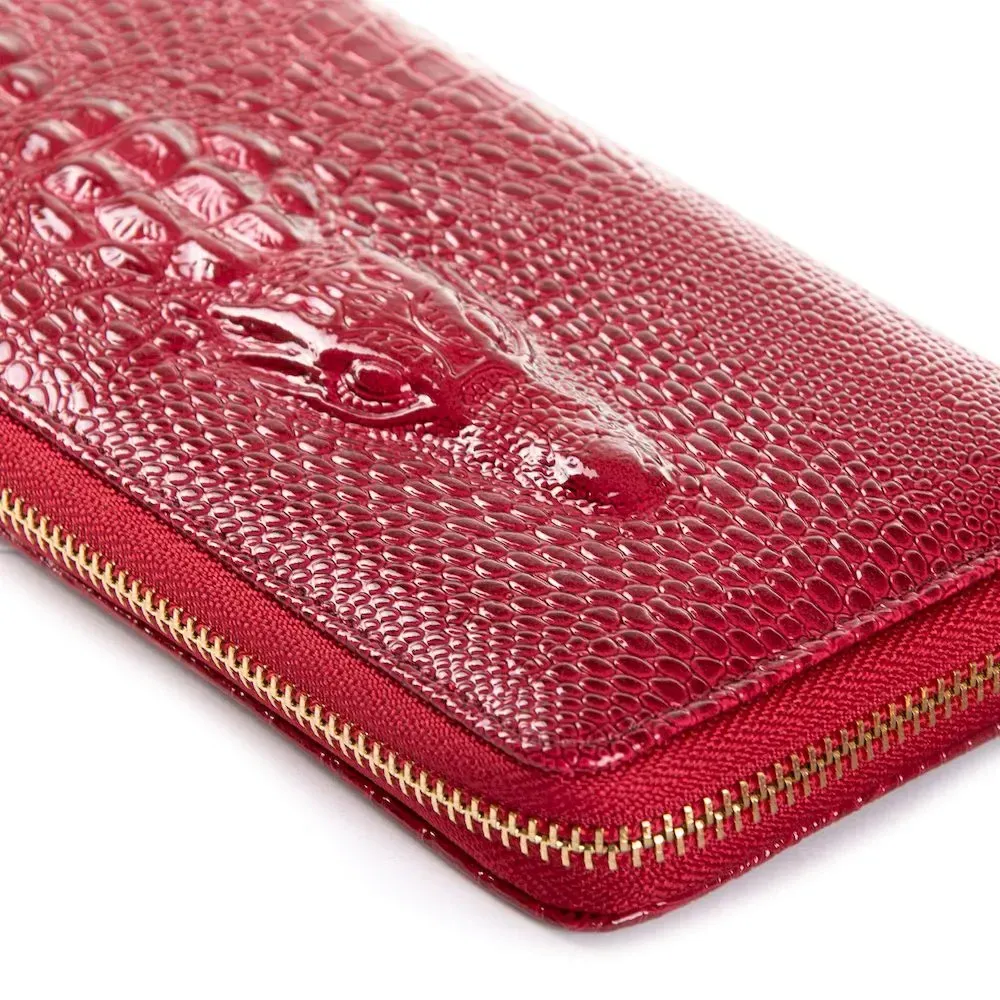 Великий жіночий гаманець-клатч. Виготовлений із якісної штучної шкіри з оригінальною тестурою. Велике відділення закривається на блискавку. Усередині 3 кишені для банкнот. Між кишенями для банкнот знаходиться кишеня для дрібниці на блискавці, з боків дві великі відкриті кишені та 8 кишень для візитних карток. У комплекті кистьовий ремінець.