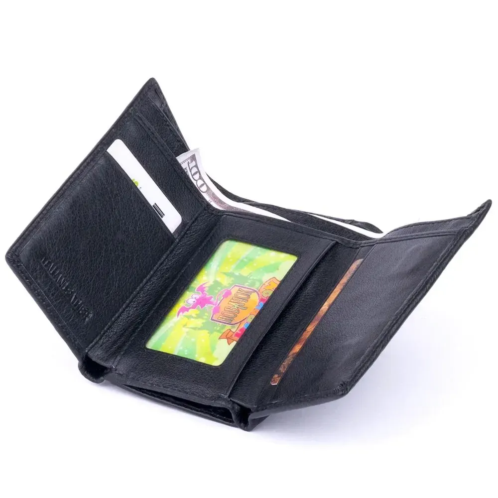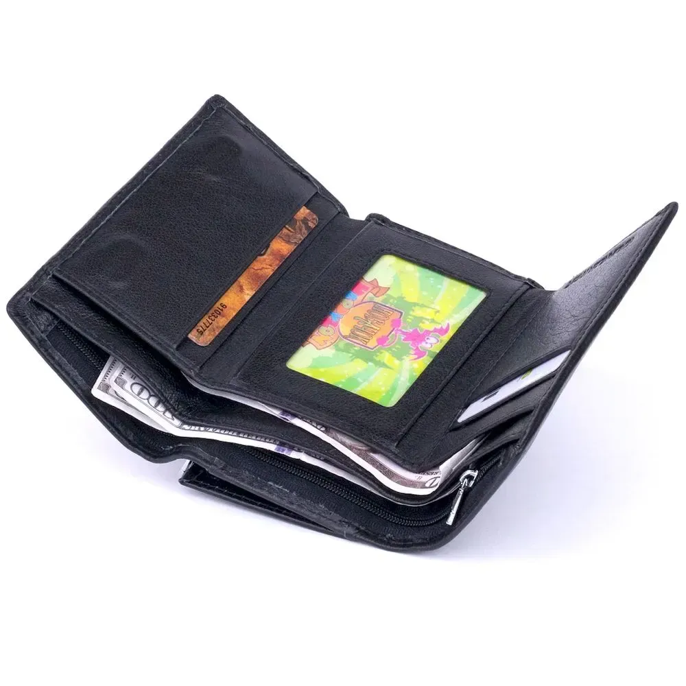 Компактний, місткий гаманець горизонтального типу в класичному стилі. Колір моделі – чорний. Гаманець у м'якій шкірі приємний на дотик. Зручно сидить у руці. Модель поміститься у маленьку сумку. Гаманець у 3 складання. На тильній стороні гаманця монетник на блискавці із двома відділеннями. У такій моделі зручно розташовувати купюри і дрібниця. Доступна вартість аксесуара приємно вас здивує. Виріб прослужить далеко не один рік. У слот під плівкою можна покласти фотографію чи іншу кредитку. Гаманець - ідеальний подарунок для близької людини.