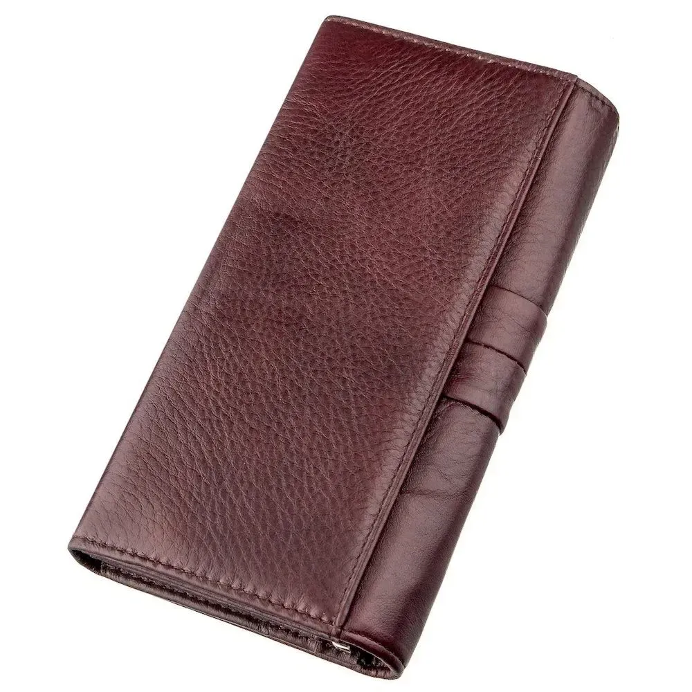 Якісний жіночий гаманець з натуральної шкіри сливово-коричневого кольору. У виріб спокійно помістяться купюри у розгорнутому вигляді. Аксесуар доповнений просторими відділеннями для купюр, осередками для карток та кишенею на блискавці. Внутрішнє оздоблення зі свинячої шкіри та текстилю високої якості. Наш інтернет-магазин пропонує величезний вибір якісної продукції за доступними цінами.
