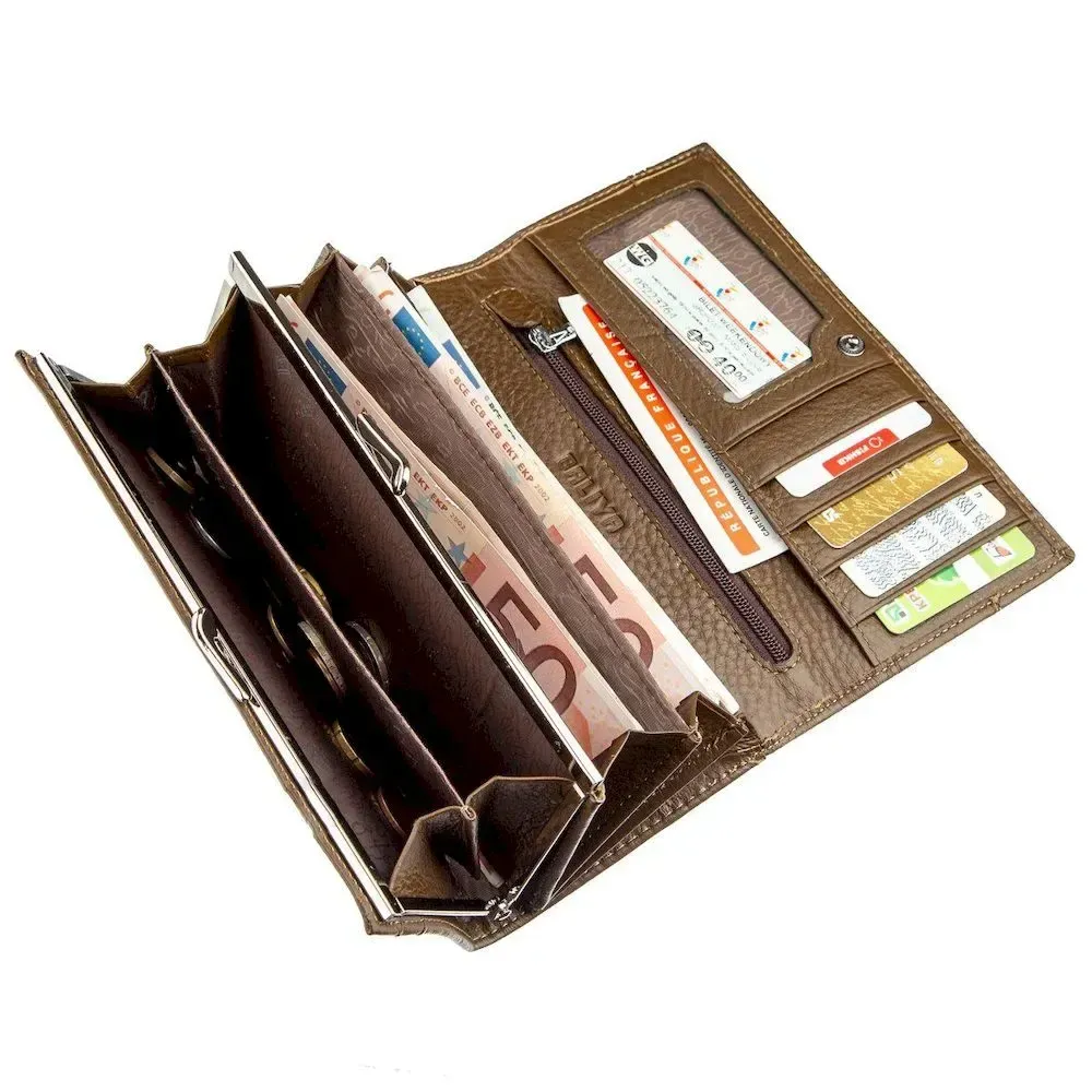 Лаконічний та простий жіночий горизонтальний гаманець. У виріб легко помістяться купюри у розгорнутому вигляді. Монетниця з класичним фіксатором та просторі відділення для купюр, осередки для карток – зручний набір для кожної дівчини. На лицьовій стороні тонка металева смужка із написом бренду. Не яскравий гаманець добре підійде під будь-який образ і поміститься в жіночу сумочку.