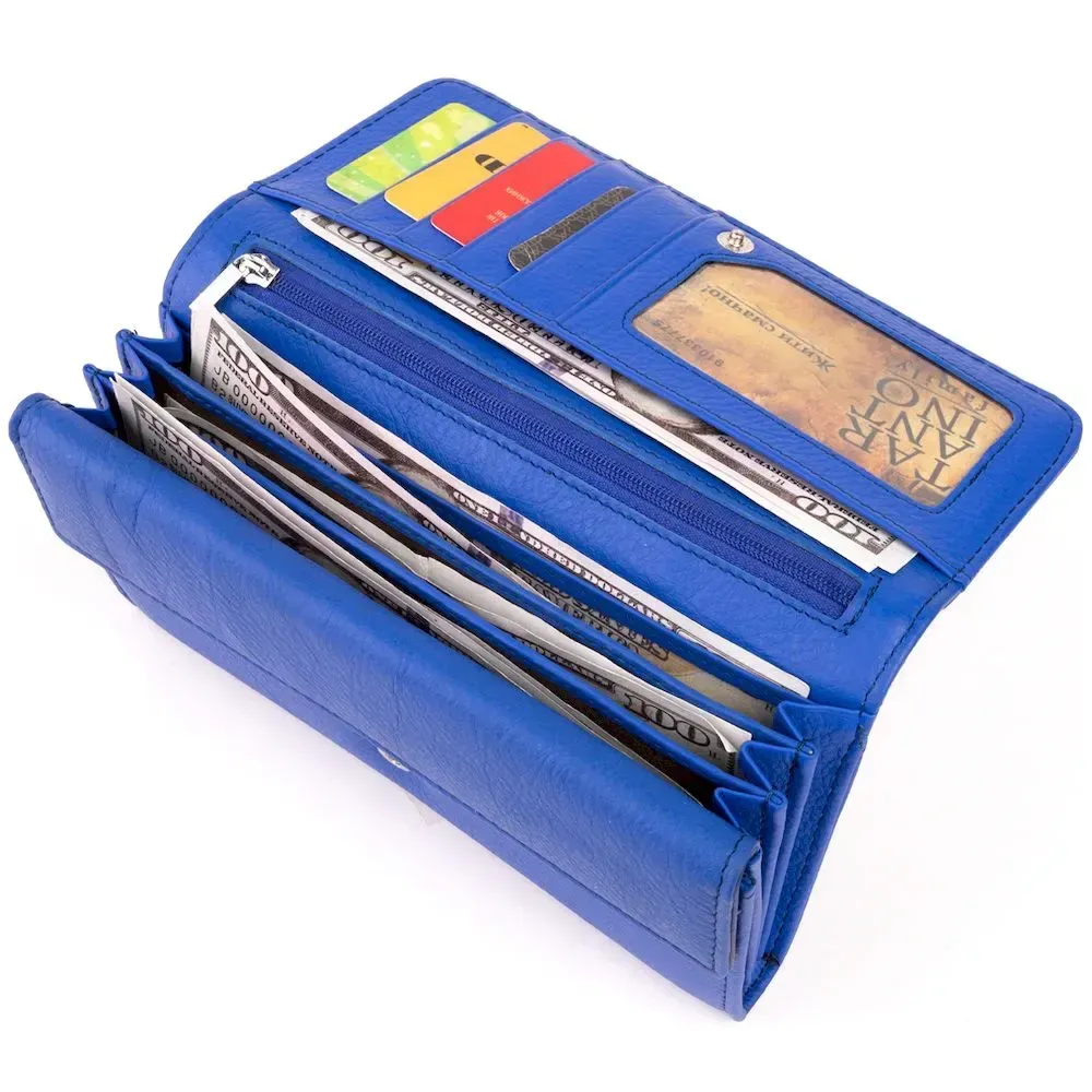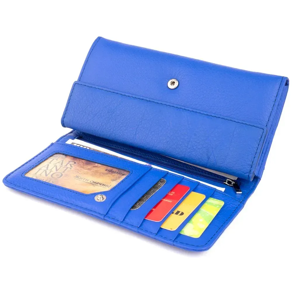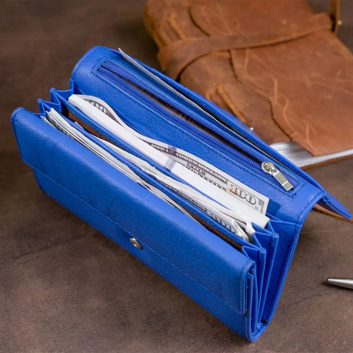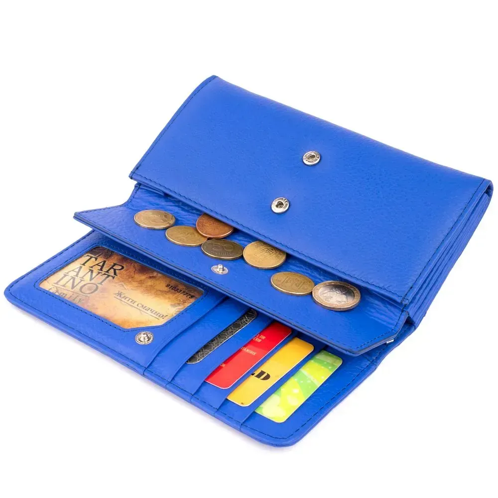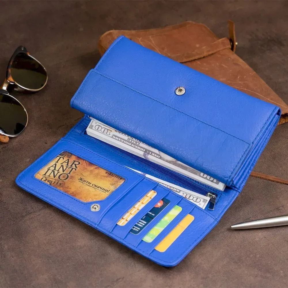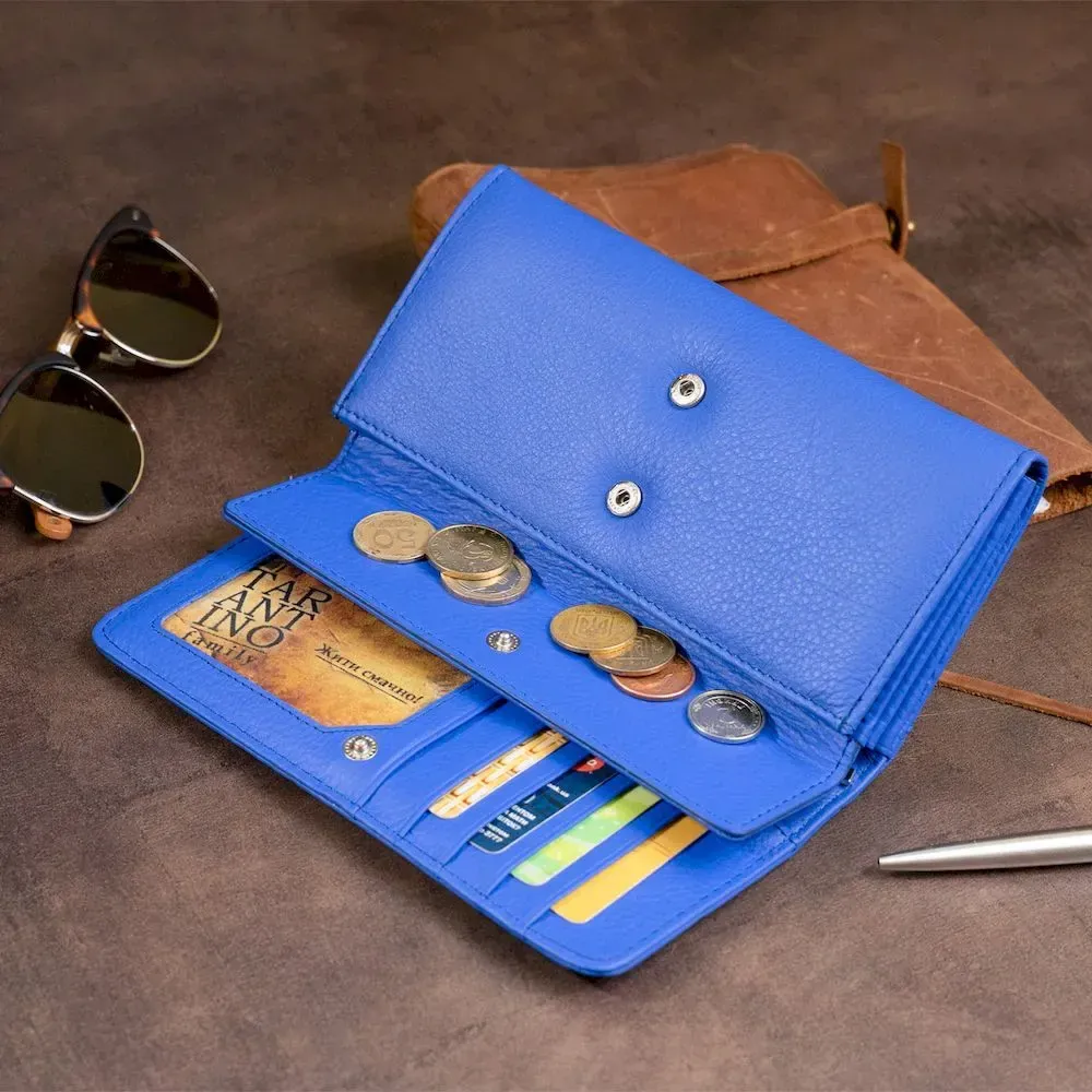 Яскравий гаманець насиченого синього кольору. Виріб виконаний виключно з натуральної шкіри. Гаманець легко поміститься в жіночу сумочку. Вміщує модель досить речей. У гаманець поміщаються купюри у розгорнутому вигляді. Виріб ідеально підійде для любителів візиток. Закривається гаманець на кнопку. Всередині: поєднання натуральної шкіри та текстилю. З таким гаманцем ваш образ буде доповненим, а його господиня не залишиться непоміченою. У комплекті йде фірмова картонна упаковка.