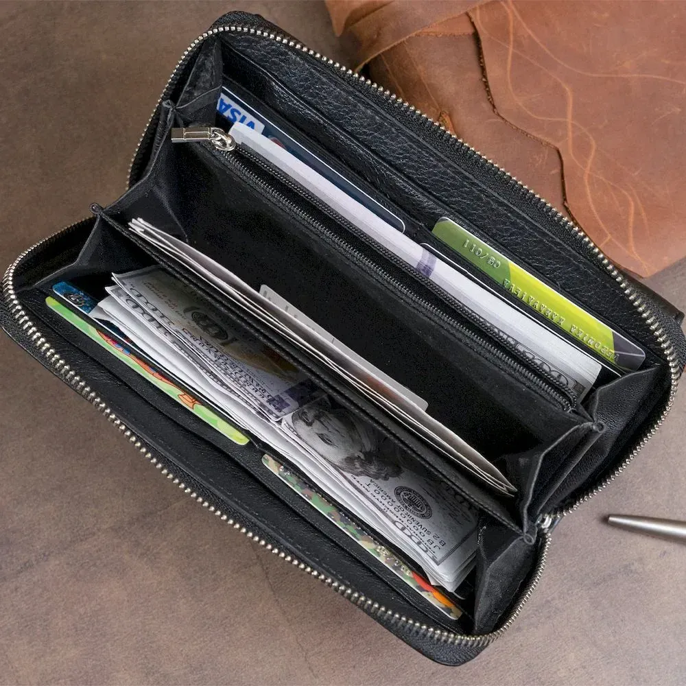Особливості: 3 великих відділення для купюр; 3 прихованих кишені (одна посередині); відділення на блискавці; 8 осередків під пластикові картки; закривається на блискавку;