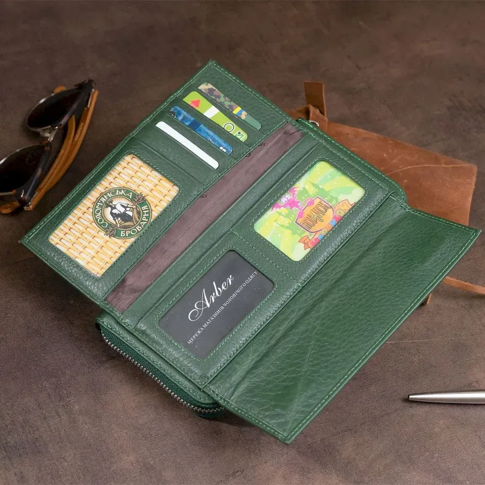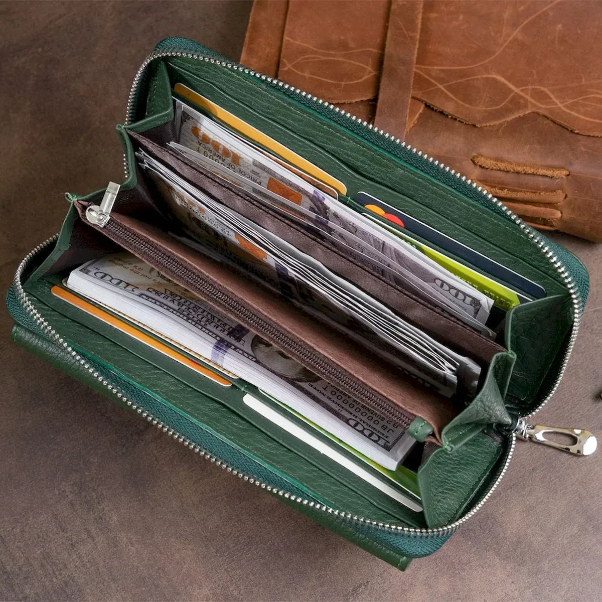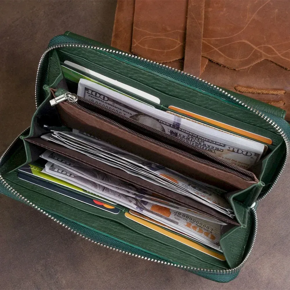 Особливості: 3 великих відділення для купюр; 3 прихованих кишені (одна посередині); відділення на блискавці; 8 осередків під пластикові картки; закривається на блискавку;