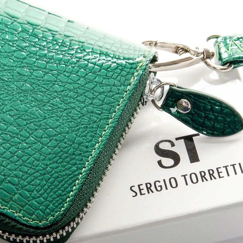 Великий жіночий гаманець-клатч Sergio Torretti. Зовнішня частина – лакова шкіра, внутрішня частина – натуральна м'яка шкіра. Закривається на блискавку. Усередині 3 відділення для банкнот, відділення для дрібниці на блискавці, дві великі відкриті кишені, 8 кишень для карток та візиток. У комплекті кистьовий ремінець.