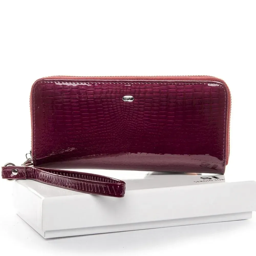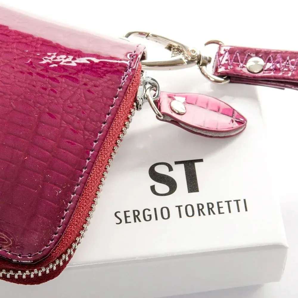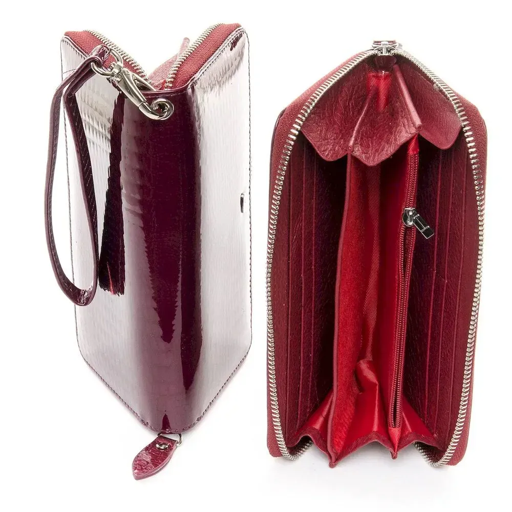Великий жіночий гаманець-клатч Sergio Torretti. Зовнішня частина – лакова шкіра, внутрішня частина – натуральна м'яка шкіра. Закривається на блискавку. Усередині 3 відділення для банкнот, відділення для дрібниці на блискавці, дві великі відкриті кишені, 8 кишень для карток та візиток. У комплекті кистьовий ремінець.
