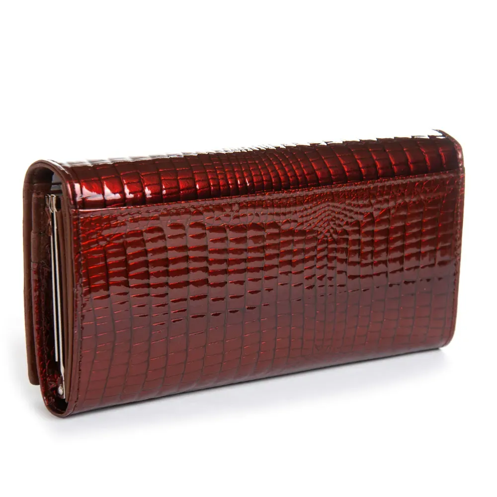 Наружная часть - рельефная лаковая кожа серии Croco, внутренняя часть - натуральная мягкая кожа. Внутри находятся 3 открытых отделения для банкнот, большой карман на молнии, двойной карман-монетница на защелке, один большой открытый карман и 9 карманов для визитных карт (один из них прозрачный). Снаружи кошелька на обратной стороне есть открытый плоский карман.