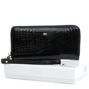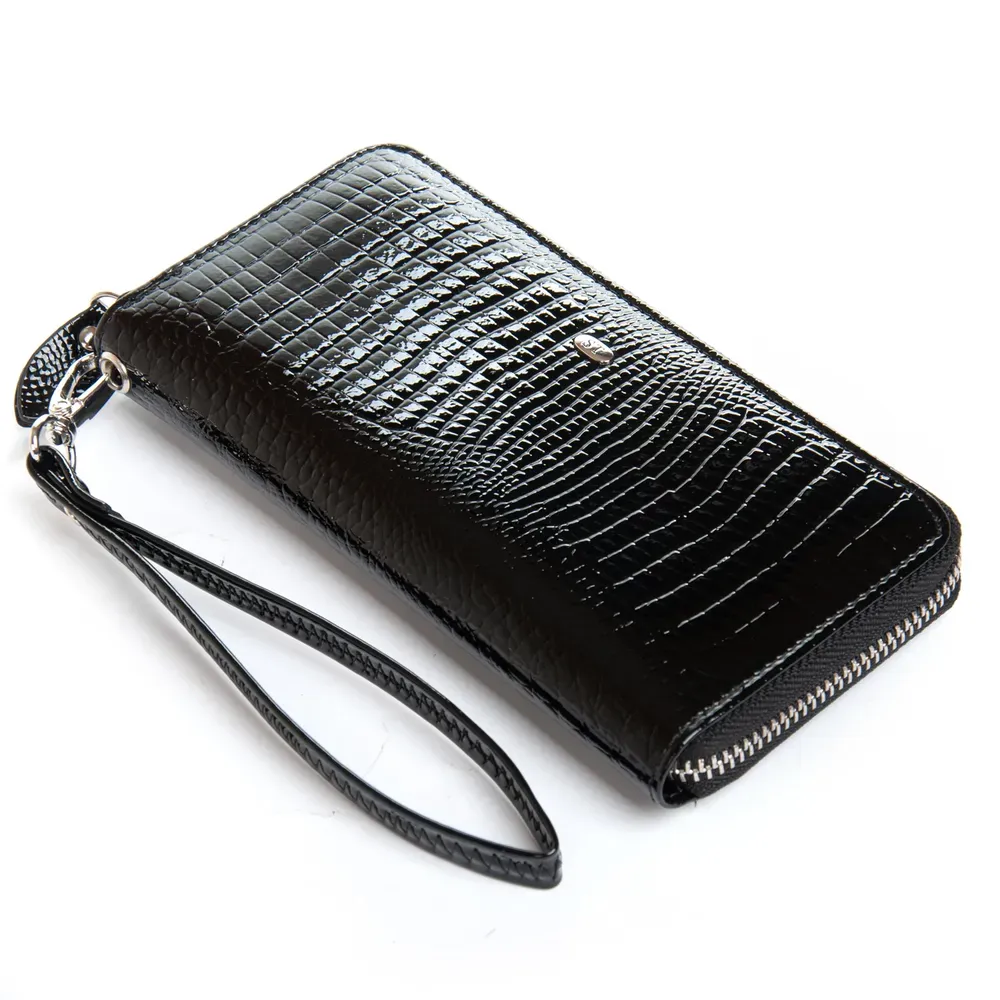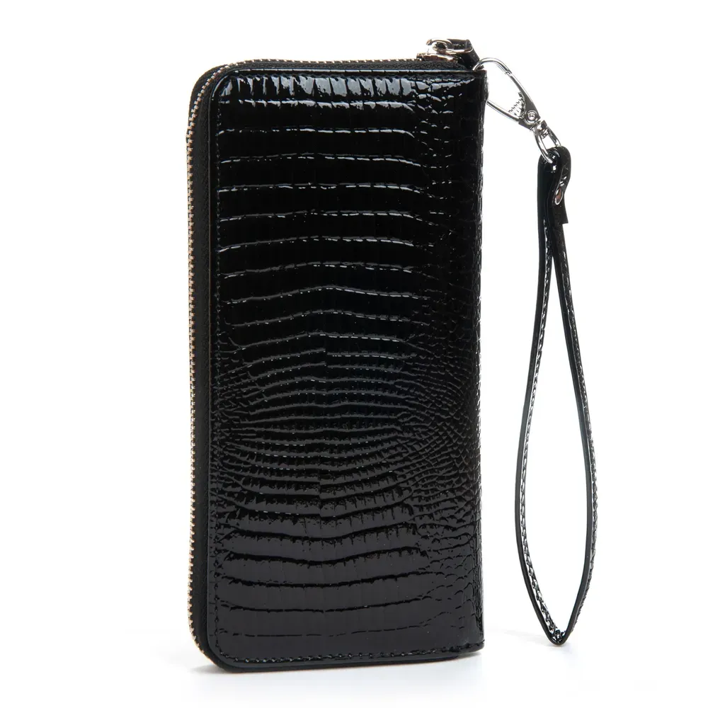 Наружная часть - рельефная лаковая кожа серии Croco, внутренняя часть - натуральная мягкая кожа. Внутри находятся 3 открытых отделения для банкнот, карман-монетница на молнии, 2 больших открытых кармана и 8 карманов для визитных карт. В комплекте кожаный ремешок на кисть.