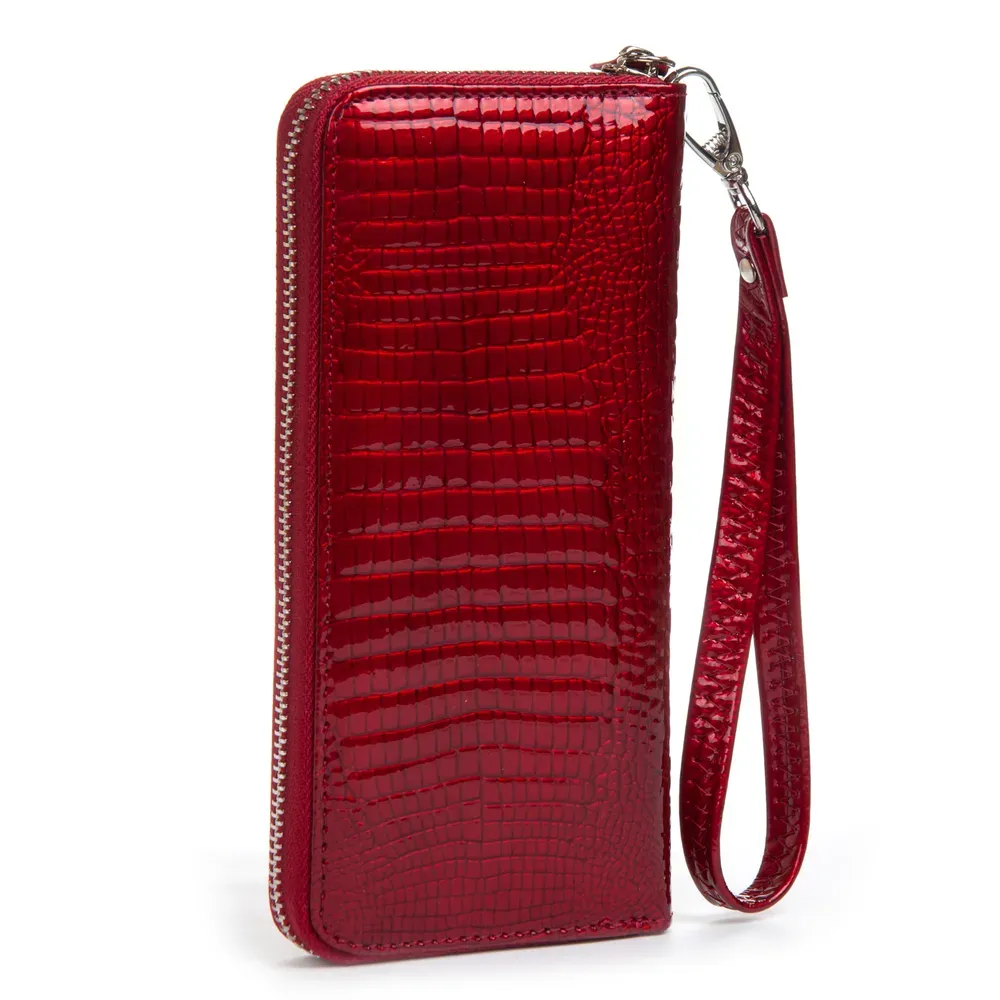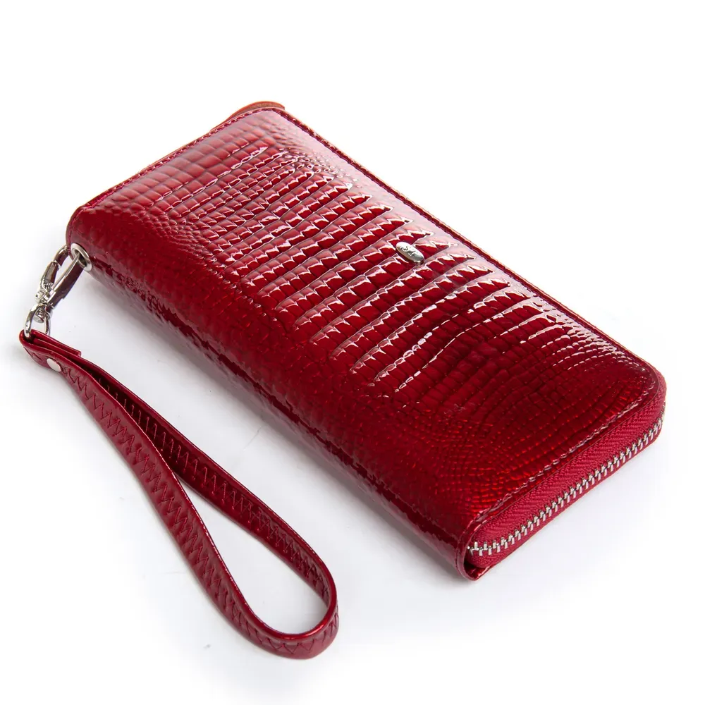 Наружная часть - рельефная лаковая кожа серии Croco, внутренняя часть - натуральная мягкая кожа. Внутри находятся 3 открытых отделения для банкнот, карман-монетница на молнии, 2 больших открытых кармана и 8 карманов для визитных карт. В комплекте кожаный ремешок на кисть.