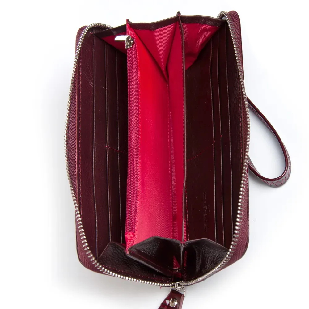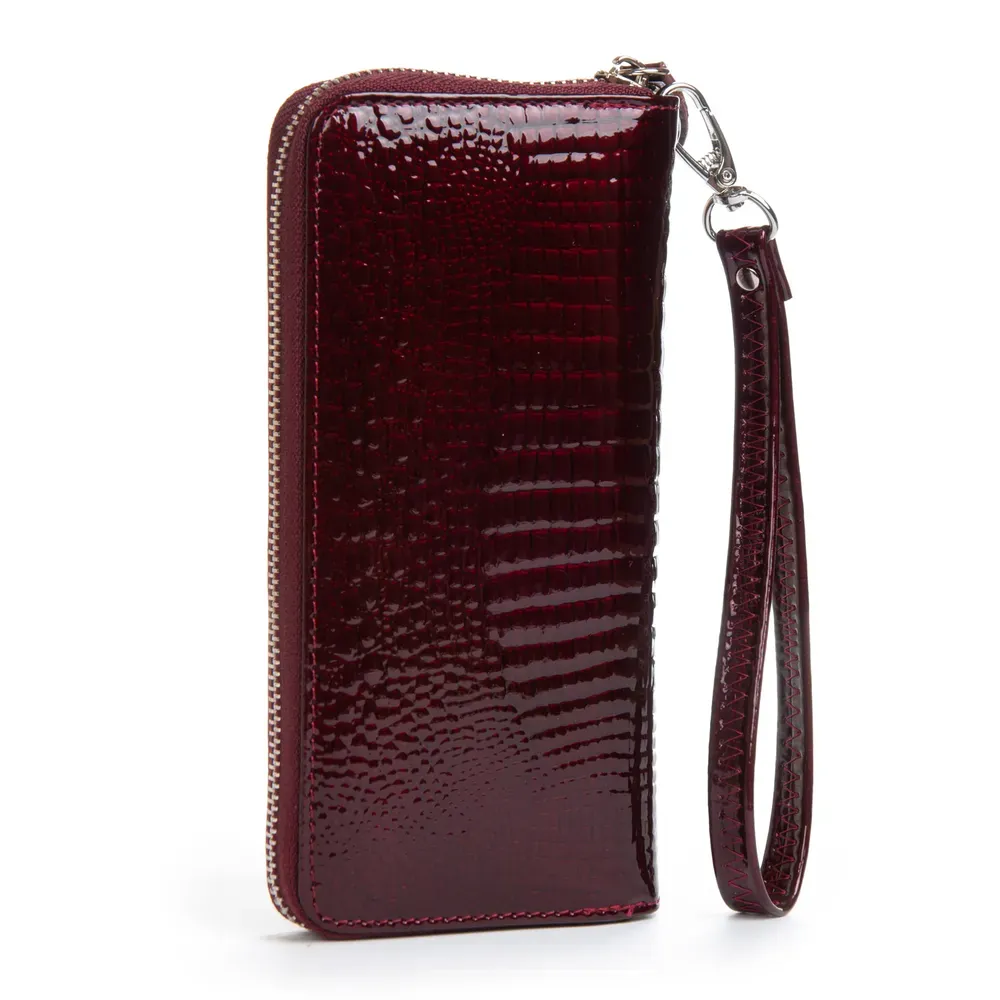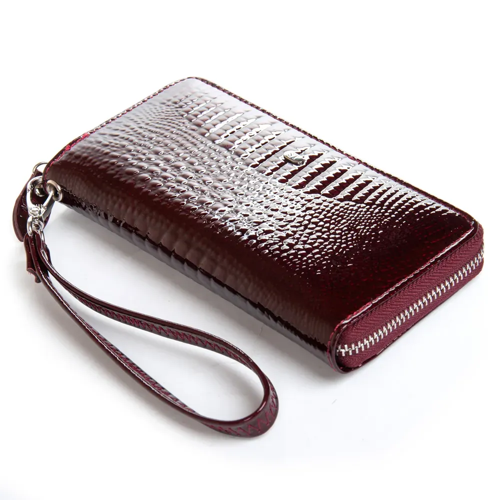 Наружная часть - рельефная лаковая кожа серии Croco, внутренняя часть - натуральная мягкая кожа. Внутри находятся 3 открытых отделения для банкнот, карман-монетница на молнии, 2 больших открытых кармана и 8 карманов для визитных карт. В комплекте кожаный ремешок на кисть.