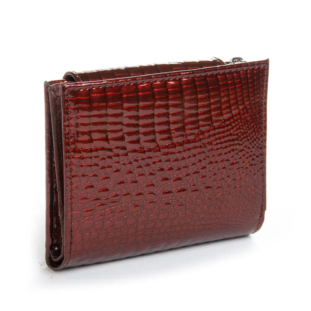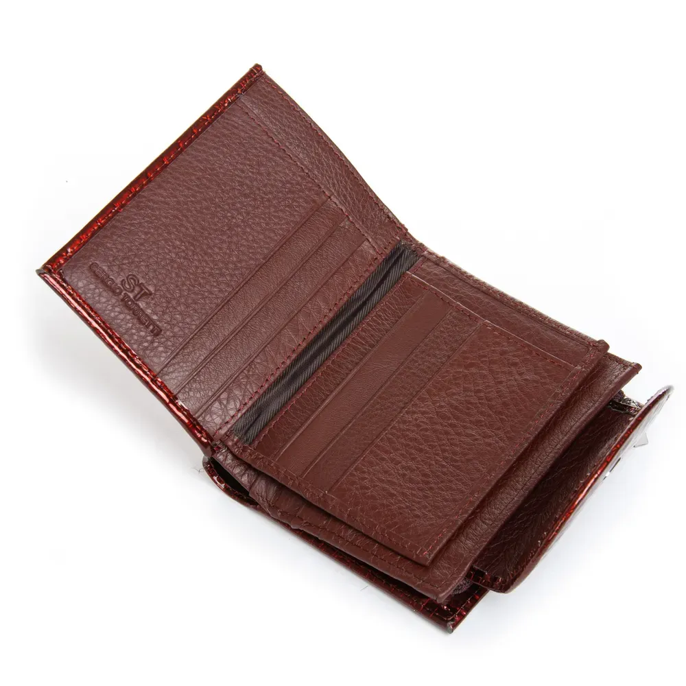 Наружная часть - рельефная лаковая кожа серии Croco, внутренняя часть - натуральная мягкая кожа. Внутри находятся 2 открытых отделения для банкнот, 3 больших открытых кармана, 11 карманов для визитных карт (один из них прозрачный). Снаружи кошелька на торце есть карман-монетница на молнии.