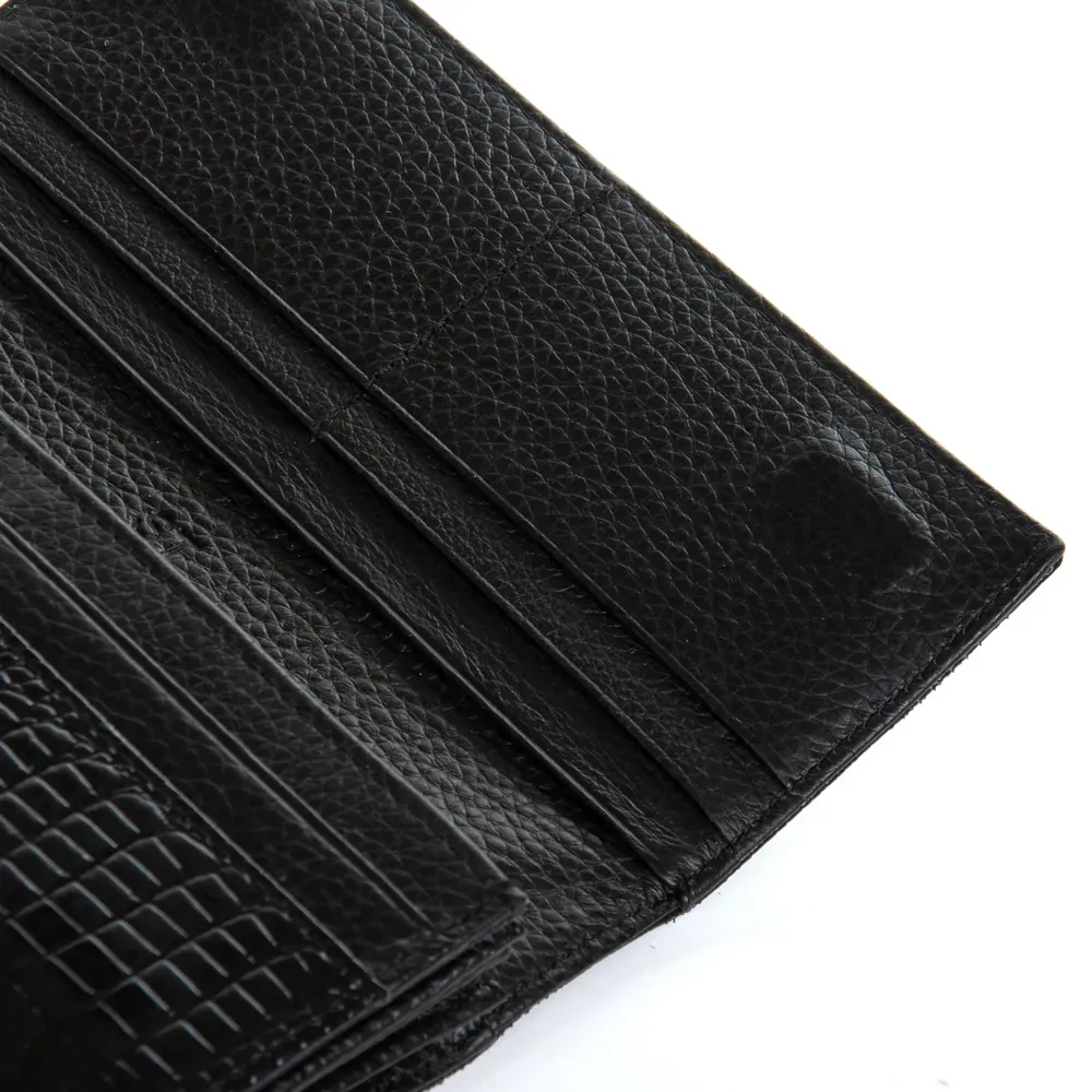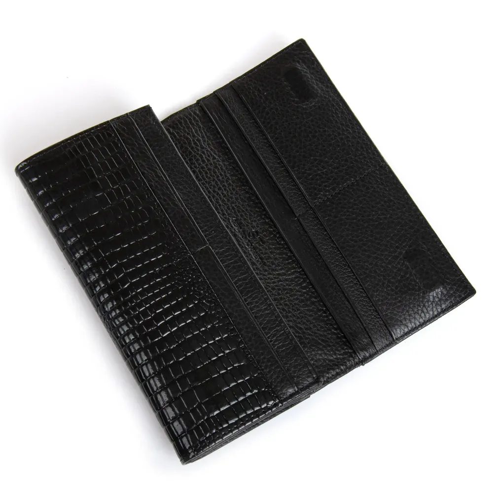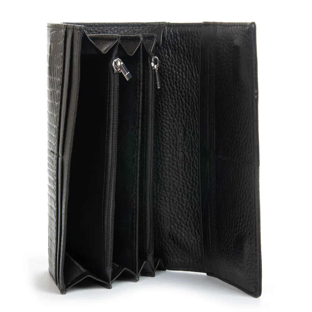 Наружная часть - рельефная лаковая кожа серии Croco, внутренняя часть - натуральная мягкая кожа. Внутри находятся 4 открытых отделения для банкнот, два кармана-монетницы на молнии, один большой открытый карман, 8 карманов для визитных карт. Снаружи кошелька на обратной стороне есть карман на молнии.