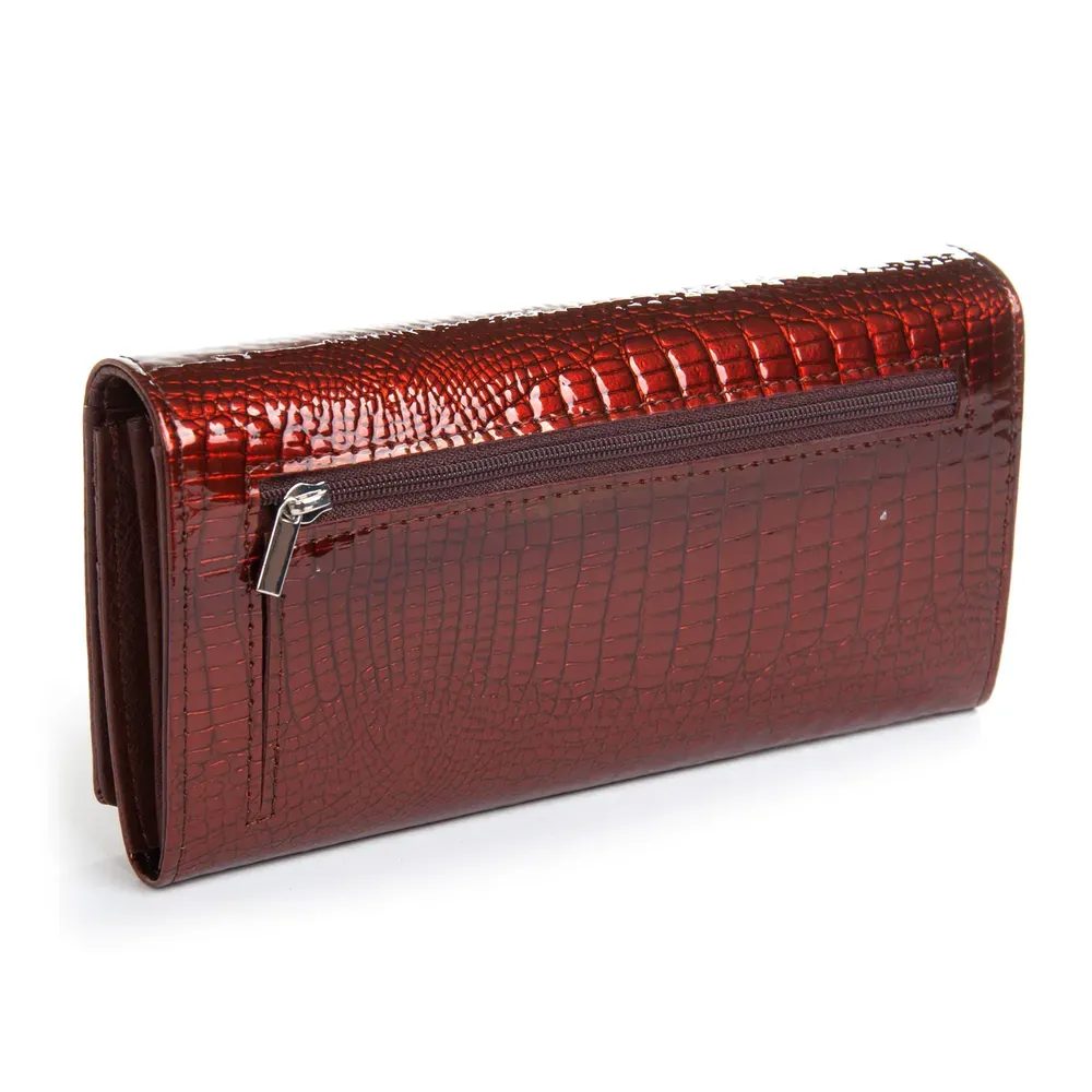 Наружная часть - рельефная лаковая кожа серии Croco, внутренняя часть - натуральная мягкая кожа. Внутри находятся 4 открытых отделения для банкнот, два кармана-монетницы на молнии, один большой открытый карман, 9 карманов для визитных карт (один из них прозрачный). Снаружи кошелька на обратной стороне есть карман на молнии.